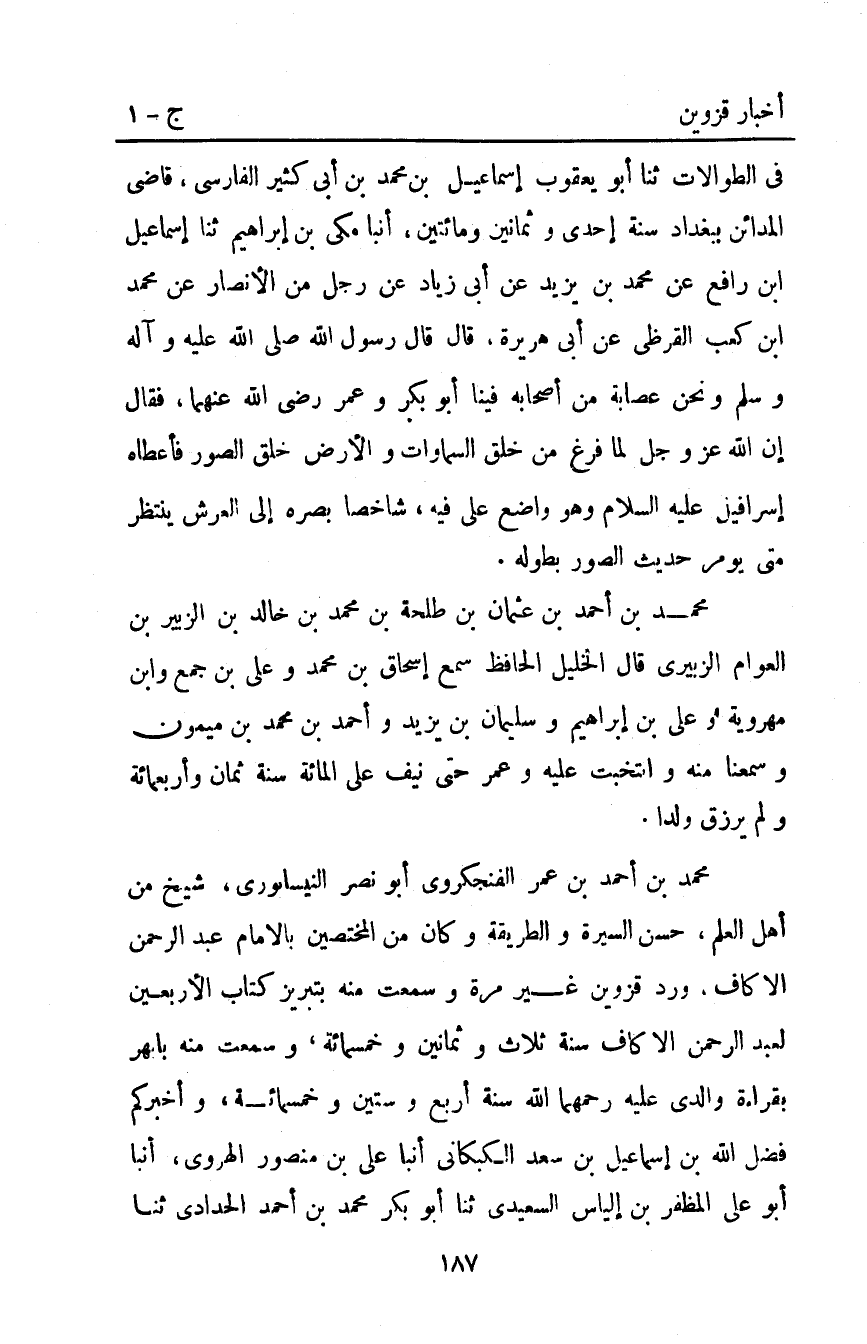 في الطوالات ثنا أَبُو يَعْقُوبَ إِسْمَاعِيلُ بْنُ مُحَمَّدِ بْنِ أَبِي كثير الفارسي قَاضِي الْمَدَائِنِ بِبَغْدَادَ سَنَةَ إِحْدَى وَثَمَانِينَ وَمِائَتَيْنِ أَنْبَأَ مَكِّيُّ بْنُ إبراهيم ثنا إسماعيل ابن رَافِعٍ عَنْ مُحَمَّدِ بْنِ يَزِيدَ عَنْ أَبِي زِيَادٍ عَنْ رَجُلٍ من الأنصار عن محمد ابن كَعْبٍ الْقَرَظِيِّ عَنْ أَبِي هُرَيْرَةَ قَالَ: قَالَ رَسُولُ اللَّهِ صَلَّى الله عليه واله وَسَلَّمَ وَنَحْنُ عُصَابَةٌ مِنْ أَصْحَابِهِ فِينَا أَبُو بَكْرٍ وَعُمَرُ رَضِيَ اللَّهُ عَنْهُمَا فَقَالَ: "إِنَّ اللَّهَ عَزَّ وَجَلَّ لَمَّا فَرَغَ مِنْ خَلْقِ السَّمَاوَاتِ وَالأَرْضَ خَلَقَ الصُّوَرَ فَأَعْطَاهُ إِسْرَافِيلَ عَلَيْهِ السَّلامُ وَهُوَ وَاضِعٌ عَلَى فِيهِ شَاخِصًا بَصَرَهُ إِلَى الْعَرْشِ يَنْتَظِرُ مَتَى يُومَرُ حَدِيثَ الصُّوَرِ بطوله".