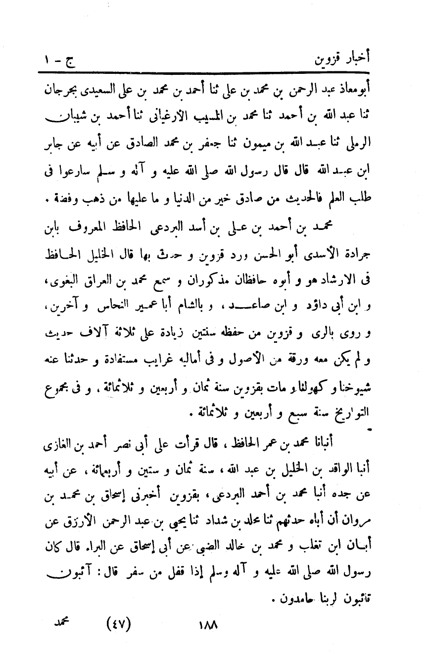 أَنْبَأَنَا مُحَمَّدُ بْنُ عُمَرَ الْحَافِظُ قَالَ قَرَأْتُ عَلَى أَبِي نَصْرٍ أَحْمَدَ بْنِ الْغَازِيِّ أَنْبَأَ الْوَاقِدُ بْنُ الْخَلِيلِ بْنِ عَبْدِ اللَّهِ سنة ثمان وستين وأربعمائة عَنْ أَبِيهِ عَنْ جَدِّهِ أَنْبَأَ مُحَمَّدُ بْنُ أَحْمَدَ الْبَرْدَعِيُّ بِقَزْوِينَ أَخْبَرَنِي إِسْحَاقُ بْنُ مُحَمَّدِ بْنِ مَرْوَانَ أَنَّ أَبَاهُ حَدَّثَهُمْ ثَنَا محلد بْنُ شَدَّادٍ ثَنَا يَحْيَى بْنُ عَبْدِ الرَّحْمَنِ الأَرْزَقُ عَنْ أَبَانٍ ابن تَغْلِبَ وَمُحَمَّدُ بْنُ خَالِدٍ الضَّبِّيِّ عَنْ أَبِي إِسْحَاقَ عَنِ الْبَرَاءِ قَالَ كَانَ رَسُولُ اللَّهِ صَلَّى اللَّهُ عَلَيْهِ وَآلِهِ وَسَلَّمَ إِذَا قفل من سفر قال: "آئبون تائبون لربنا حامدون".