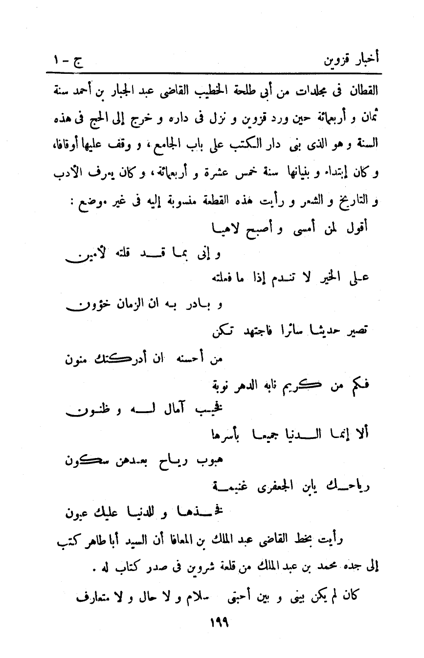 القطان في مجلدات من أبي طلحة الخطيب القاضي عَبْد الجبار بن أحمد سنة ثمان وأربعمائة حين ورد قزوين ونزل في داره وخرج إلى الحج في هذه السنة وهو الذي بنى دار الكتب على باب الجامع ووقف عليها أوقافا وكان ابتداء وبنيانها سنة خمس عشرة وأربعمائة وكان يعرف الأدب والتاريخ والشعر ورأيت هذه القطعة منسوبة إليه في غير موضع: