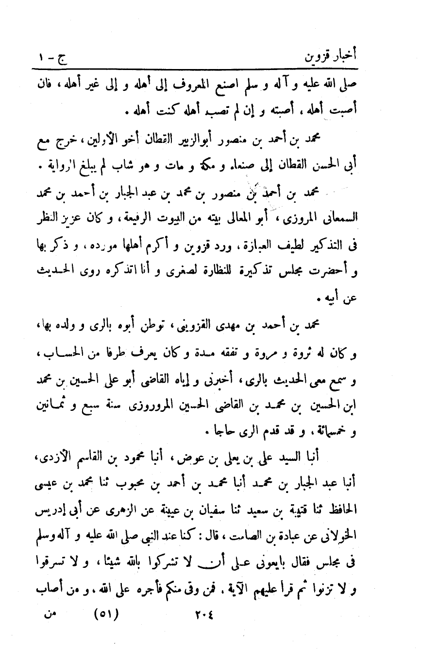 أَنْبَأَ السَّيِّدُ عَلِيُّ بْنُ يَعْلَى بْنِ عَوَضٍ أَنْبَأَ مَحْمُودُ بْنُ الْقَاسِمِ الأَزْدِيُّ أَنْبَأَ عَبْدُ الْجَبَّارِ بْنُ مُحَمَّدٍ أَنْبَأَ مُحَمَّدُ بْنُ أَحْمَدَ بْنِ مَحْبُوبٍ ثَنَا مُحَمَّدُ بْنُ عِيسَى الْحَافِظُ ثَنَا قُتَيْبَةُ بْنُ سَعِيدٍ ثَنَا سُفْيَانُ بْنُ عُيَيْنَةَ عَنِ الزُّهْرِيِّ عَنْ أَبِي إِدْرِيسَ الْخَوْلانِيِّ عَنْ عُبَادَةَ بْنِ الصَّامِتِ قَالَ: كُنَّا عِنْدَ النَّبِيِّ صَلَّى اللَّهُ عَلَيْهِ وَآلِهِ وَسَلَّمَ فِي مَجْلِسٍ فَقَالَ: "بَايِعُونِي عَلَى أَنْ لا تُشْرِكُوا بِاللَّهِ شَيْئًا وَلا تَسْرِقُوا وَلا تَزْنُوا" ثُمَّ قَرَأَ عَلَيْهِمُ الآيَةَ "فَمَنْ وَفَّى مِنْكُمْ فَأَجْرُهُ عَلَى اللَّهِ وَمَنْ أَصَابَ