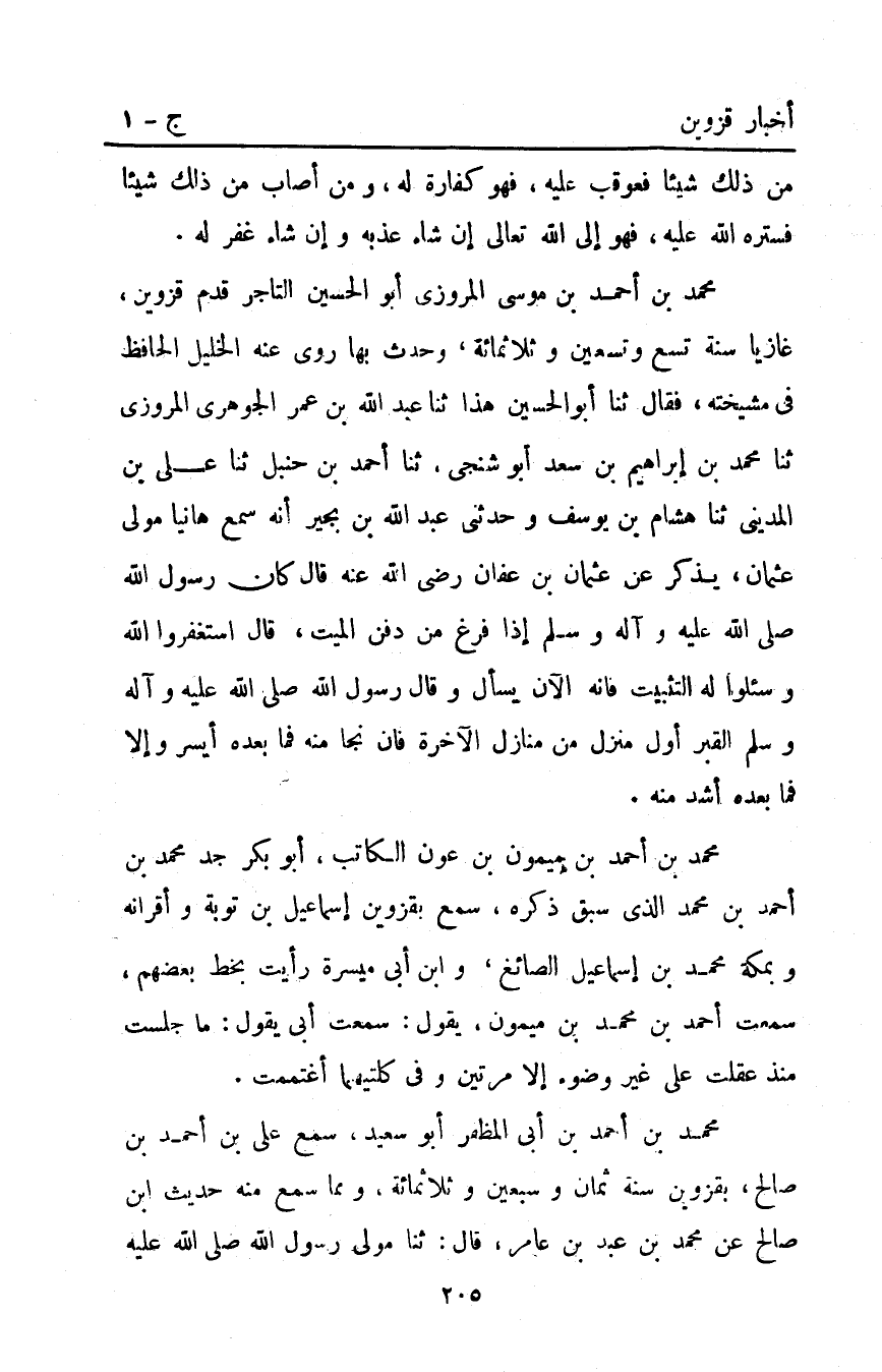 مُحَمَّد بْن أَحْمَدَ بْن موسى المروزي أبو الحسين التاجر قدم قزوين غازيا سنة تسع وتسعين وثلاثمائة وحدث بها روى عنه الخليل الحافظ في مشيخته فقال ثَنَا أَبُو الْحُسَيْنِ هَذَا ثَنَا عَبْدُ اللَّهِ بْنُ عُمَرَ الْجَوْهَرِيُّ الْمَرْوَزِيُّ ثَنَا مُحَمَّدُ بْنُ إِبْرَاهِيمَ بْنِ سَعْدٍ أَبِو شِنْجِيِّ ثَنَا أَحْمَدُ بْنُ حَنْبَلٍ ثَنَا عَلِيُّ بْنُ الْمَدِينِيُّ ثَنَا هِشَامُ بْنُ يُوسُفَ وَحَدَّثَنِي عَبْدُ اللَّهِ بْنُ بُجَيْرٍ أَنَّهُ سَمِعَ هَانِيًا مَوْلَى عُثْمَانَ يَذْكُرُ عَنْ عُثْمَانَ بْنِ عَفَّانَ رَضِيَ اللَّهُ عَنْهُ قَالَ كَانَ رَسُولُ اللَّهِ صَلَّى اللَّهُ عَلَيْهِ واله وَسَلَّمَ إِذَا فَرَغَ مِنْ دَفْنِ الميت قال: "استغفروا الله وسئلوا لَهُ التَّثْبِيتَ فَإِنَّهُ الآنَ يُسْأَلُ". وَقَالَ رَسُولُ اللَّهِ صَلَّى اللَّهُ عليه وسلم: "القبر أول منزل مِنْ مَنَازِلِ الآخِرَةِ فَإِنْ نَجَا مِنْهُ فَمَا بَعْدَهُ أَيْسَرُ وَإِلا فَمَا بَعْدَهُ أَشَدُّ مِنْهُ".