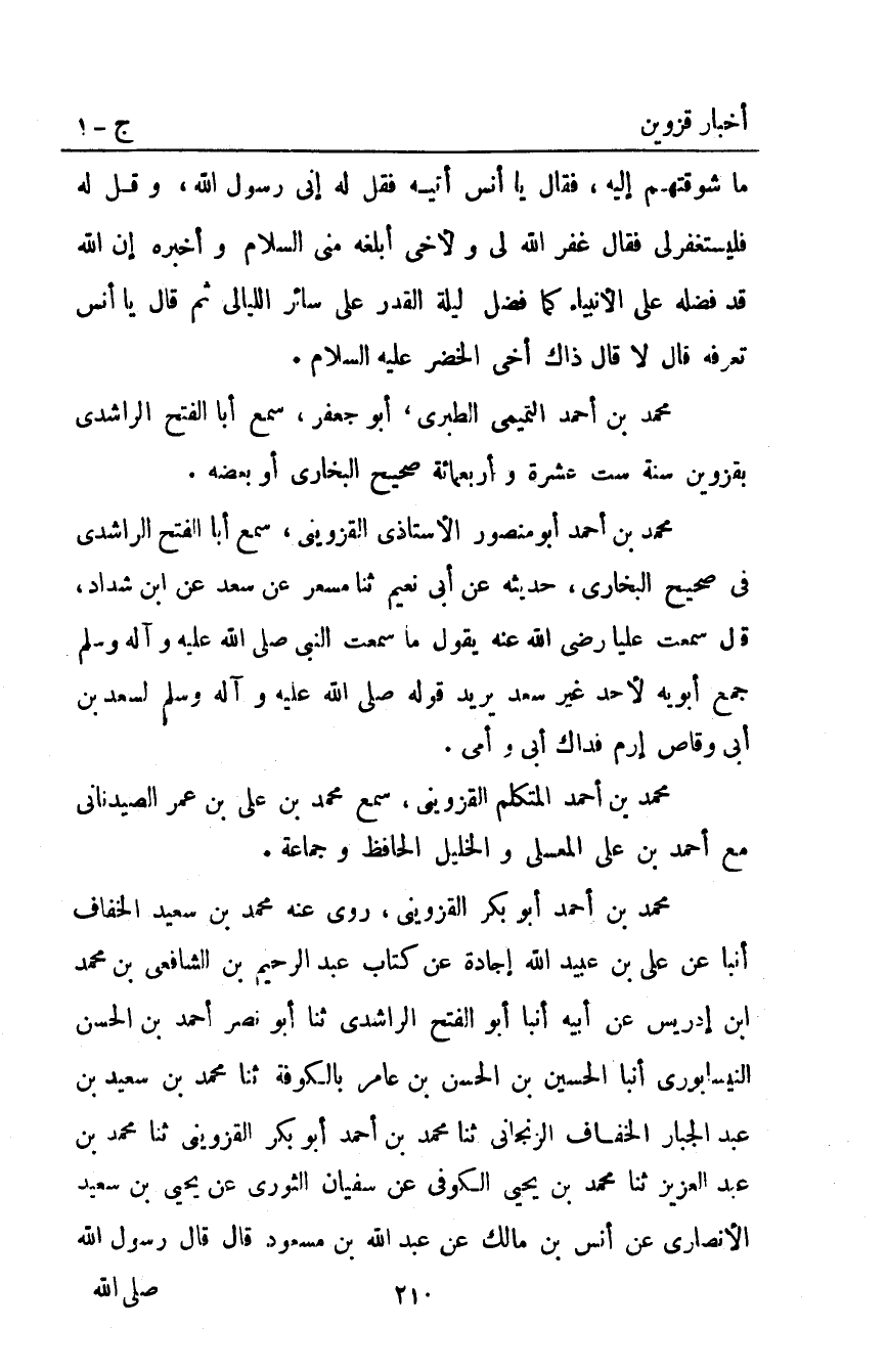 مُحَمَّد بْن أَحْمَدَ أبو بكر القزويني روى عنه مُحَمَّد بْن سعيد الخفاف أَنْبَأَ عَنْ عَلِيِّ بْنِ عُبَيْدِ اللَّهِ إِجَادَةً عَنْ كِتَابِ عَبْد الرحيم بْن الشافعي بْن محمد ابن إِدْرِيسَ عَنْ أَبِيهِ أَنْبَأَ أَبُو الْفَتْحِ الرَّاشِدِيُّ ثَنَا أَبُو نَصْرٍ أَحْمَدُ بْنُ الْحَسَنِ النَّيْسَابُورِيُّ أَنْبَأَ الْحُسَيْنُ بْنُ الْحَسَنِ بْنِ عَامِرٍ بِالْكُوفَةِ ثَنَا مُحَمَّدُ بْنُ سَعِيدِ بْنِ عَبْدِ الْجَبَّارِ الْخَفَّافُ الزَّنْجَانِيُّ ثَنَا مُحَمَّدُ بْنُ أَحْمَدَ أَبُو بَكْرٍ الْقَزْوِينِيُّ ثَنَا مُحَمَّدُ بْنُ عَبْدِ الْعَزِيزِ ثَنَا مُحَمَّدُ بْنُ يَحْيَى الْكُوفِيُّ عَنْ سُفْيَانَ الثَّوْرِيِّ عَنْ يَحْيَى بْنِ سَعِيدٍ الأَنْصَارِيِّ عَنْ أَنَسِ بْنِ مَالِكٍ عَنِ عَبْدِ اللَّهِ بْنِ مَسْعُودٍ قَالَ: قال رسول الله