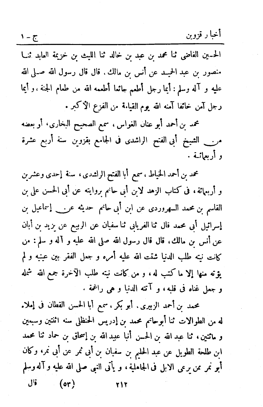 مُحَمَّد بْن أَحْمَدَ الخياط سَمِعَ أَبَا الْفَتْحِ الرَّاشِدِيَّ سَنَةَ إِحْدَى وعشرين وأربعمائة فِي كِتَابِ الزُّهْدِ لابْنِ أَبِي حَاتِمٍ بِرِوَايَتِهِ عَنْ أَبِي الْحَسَنِ عَلِيِّ بْنِ الْقَاسِمِ بْنِ مُحَمَّدٍ السُّهْرَوَرْدِيِّ عَنِ ابْنِ أَبِي حَاتِمٍ حَدِيثُهُ عَنْ إِسْمَاعِيلَ بْنِ إِسْرَائِيلَ أَبِي مُحَمَّدٍ قَالَ ثَنَا الْفِرْيَابِيُّ ثَنَا سُفْيَانُ عَنِ الرَّبِيعِ عَنْ يَزِيدَ بْنِ أَبَانٍ عَنْ أَنَسِ بْنِ مَالِكٍ قَالَ: قَالَ رَسُولُ اللَّهِ صَلَّى اللَّهُ عَلَيْهِ وَآلِهِ وَسَلَّمَ: "مَنْ كَانَتْ نِيَّتَهُ طَلَبُ الدُّنْيَا شَتَّتَ اللَّهُ عَلَيْهِ أَمْرَهُ وَجَعَلَ الْفَقْرَ بَيْنَ عَيْنَيْهِ وَلَمْ يُؤْتِهِ مِنْهَا إِلا مَا كُتِبَ لَهُ وَمَنْ كَانَتْ نِيَّتَهُ طَلَبُ الآخِرَةِ جَمَعَ اللَّهُ شَمْلَهُ وَجَعَلَ غِنَاهُ فِي قَلْبِهِ وَآتَتْهُ الدُّنْيَا وَهِيَ رَاغِمَةٌ".