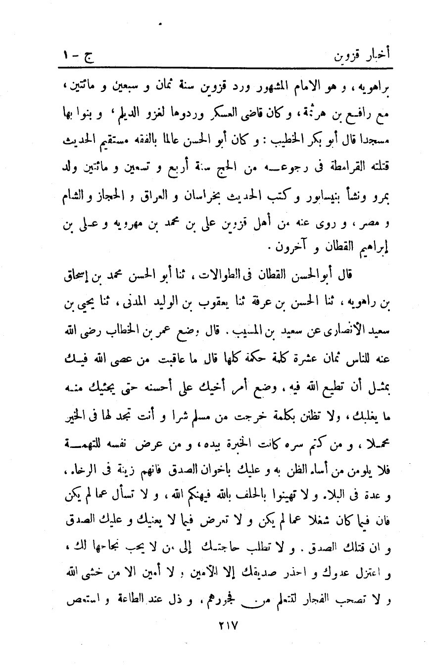 براهويه وهو الإمام المشهور ورد قزوين سنة ثمان وسبعين ومائتين مع رافع بْن هرثمة وكان قاضي العسكر وردوها لغزو الديلم وبنوا بها مسجدا قَالَ أبو بكر الخطيب: وكان أبو الحسن عالما بالفقه مستقيم الحديث قتلته القرامطة في رجوعه من الحج سنة أربع وتسعين ومائتين ولد بمرو ونشأ بنيسابور وكتب الحديث بخراسان والعراق والحجاز والشام ومصر وروى عنه من أهل قزوين عَلِيُّ بْنُ مُحَمَّدِ بْنِ مَهْرَوَيْهِ وعلي بْن إبراهيم القطان وآخرون.