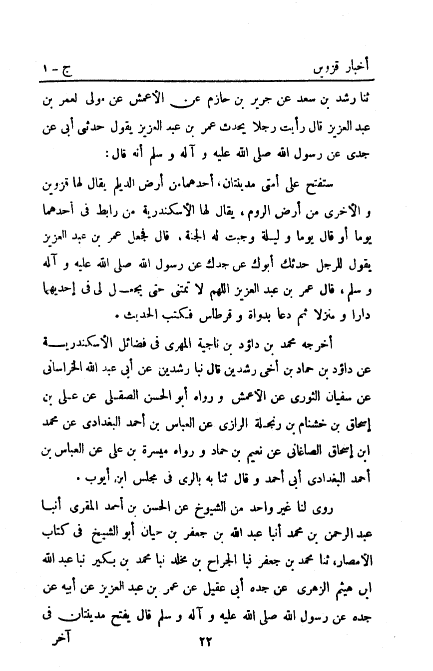 روى لنا غَيْرُ وَاحِدٍ مِنَ الشُّيُوخِ عَنِ الْحَسَنُ بْنُ أَحْمَدَ الْمُقْرِي أنبا عَبْدُ الرَّحْمَنِ بْنُ مُحَمَّدٍ أَنْبَا عَبْدُ اللَّهِ بْنُ جَعْفَرِ بْنِ حَيَّانَ أَبُو الشَّيْخِ فِي كِتَابِ الأَمْصَارِ ثَنَا مُحَمَّدُ بْنُ جَعْفَرٍ نَبَّأَ الْجَرَّاحُ بْنُ مَخْلَدٍ نَبَّأَ مُحَمَّدُ بْنُ بُكَيْرٍ نَبَّأَ عَبْدُ الله ابن هَيْثَمٍ الزُّهْرِيُّ عَنْ جَدِّهِ أَبِي عُقَيْلٍ عَنْ عُمَرَ بْنِ عَبْدِ الْعَزِيزِ عَنْ أَبِيهِ عَنْ جَدِّهِ عَنْ رَسُولِ اللَّهِ صَلَّى اللَّهُ عليه واله وَسَلَّمَ قَالَ: "يُفْتَحُ مَدِينَتَانِ فِي