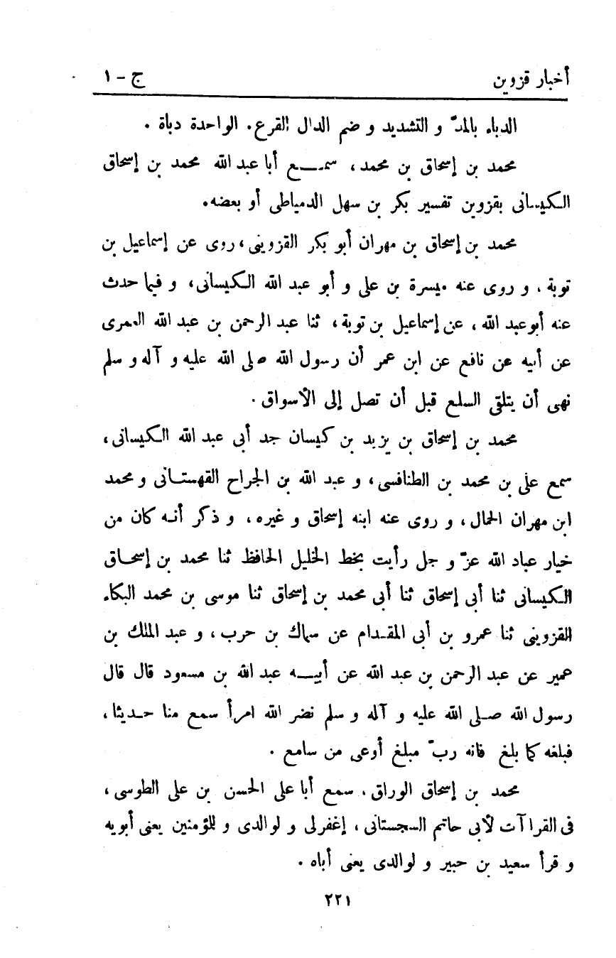 مُحَمَّد بْن إسحاق بْن يزيد بْن كيسان جد أبي عَبْد اللَّه الكيساني سمع علي بْن مُحَمَّد بْن الطنافسي وعَبْد اللَّه بن الجراح القهستاني ومحمد ابن مهران الحمال وروى عنه ابنه إسحاق وغيره وذكر أنه كان من خيار عباد اللَّه عز وجل رَأَيْتُ بِخَطِّ الْخَلِيلِ الْحَافِظِ ثَنَا مُحَمَّدُ بْنُ إِسْحَاقَ الْكَيْسَانِيُّ ثَنَا أَبِي إِسْحَاقَ ثَنَا أَبِي مُحَمَّدُ بْنُ إِسْحَاقَ ثَنَا مُوسَى بْنُ مُحَمَّدٍ الْبَكَّاءُ الْقَزْوِينِيُّ ثَنَا عَمْرُو بْنُ أَبِي الْمِقْدَامِ عَنْ سِمَاكِ بْنِ حَرْبٍ وَعَبْدِ الْمَلِكِ بْنِ عُمَيْرٍ عَنْ عَبْدِ الرَّحْمَنِ بْنِ عَبْدِ اللَّهِ عَنْ أَبِيهِ عَبْدِ اللَّهِ بْنِ مَسْعُودٍ قَالَ قَالَ رَسُولُ اللَّهِ صَلَّى اللَّهُ عليه واله وَسَلَّمَ: "نَضَّرَ اللَّهُ امْرَأً سَمِعَ مِنَّا حَدِيثًا فَبَلَّغَهُ كَمَا بَلَّغَ فَإِنَّهُ رُبَّ مُبَلَّغٍ أَوْعَى مِنْ سَامِعٍ".