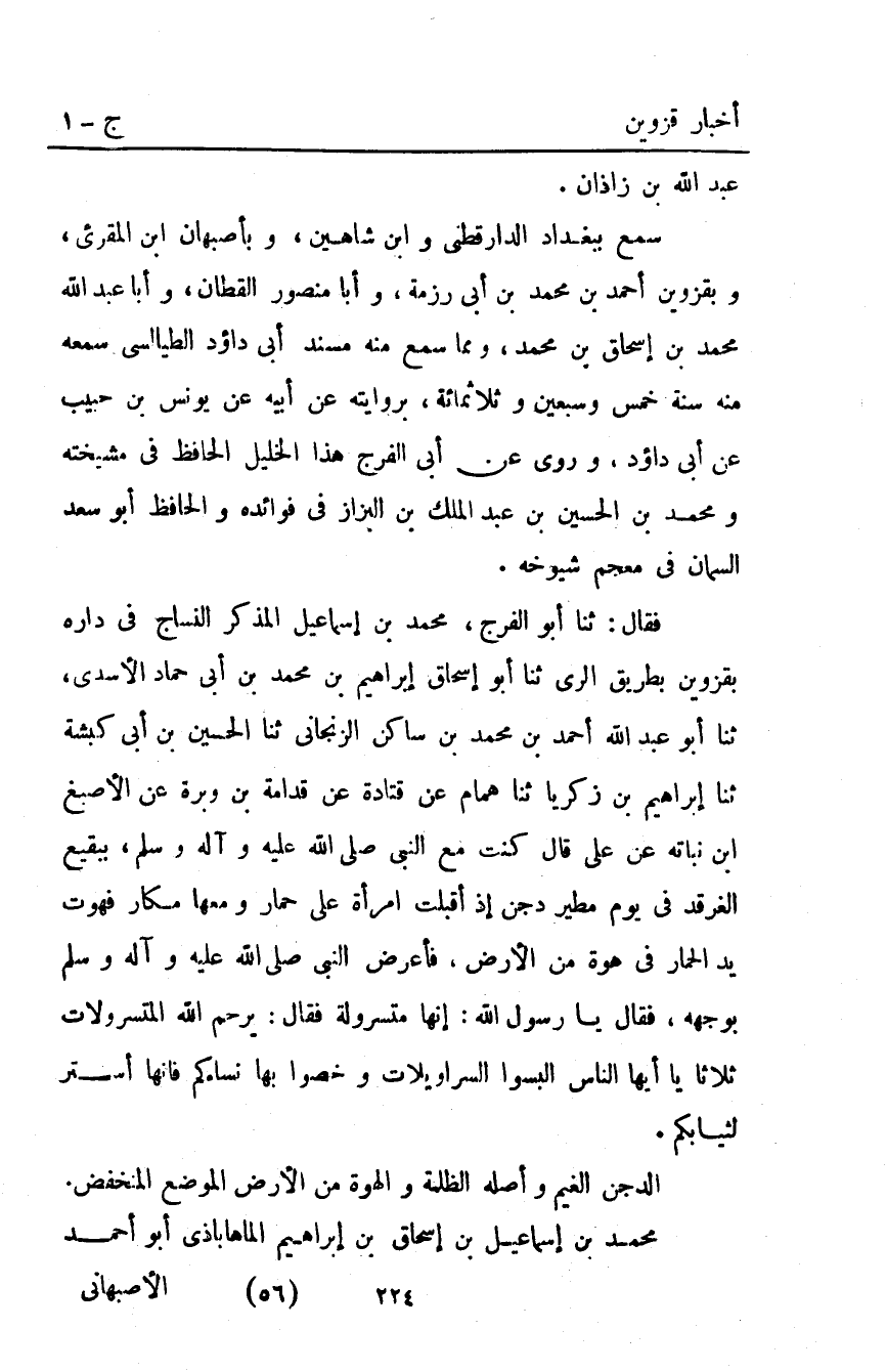 فقال: ثَنَا أَبُو الْفَرَجِ مُحَمَّدُ بْنُ إِسْمَاعِيلَ الْمُذَكَّرُ النَّسَّاجُ فِي دَارِهِ بِقَزْوِينَ بِطَريِقِ الرَّيِّ ثَنَا أَبُو إِسْحَاقَ إِبْرَاهِيمُ بْنُ مُحَمَّدِ بْنِ أَبِي حَمَّادٍ الأَسْدِيُّ ثَنَا أَبُو عَبْدِ اللَّهِ أَحْمَدُ بْنُ مُحَمَّدِ بْنِ سَاكِنٍ الزَّنْجَانِيُّ ثَنَا الْحُسَيْنُ بْنُ أَبِي كَبْشَةَ ثَنَا إِبْرَاهِيمُ بْنُ زَكَرِيَّا ثَنَا هَمَّامٌ عَنْ قَتَادَةَ عَنْ قُدَامَةَ بن وبرة عن الأصبغ ابن نُبَاتَةَ عَنْ عَلِيٍّ قَالَ كُنْتُ مع النبي صلى اللَّه عليه واله وَسَلَّمَ بِبَقِيعِ الْغَرْقَدِ فِي يَوْمٍ مَطِيرٍ دَجْنٍ إِذْ أَقْبَلَتِ امْرَأَةٌ عَلَى حِمَارٍ وَمَعَهَا مُكَارٌ فَهَوَتْ يَدُ الْحِمَارِ فِي هُوَّةِ مِنَ الأَرْضِ فَأَعْرَضَ النَّبِيُّ صَلَّى اللَّهُ عليه واله وَسَلَّمَ بِوَجْهِهِ فَقَالَ: يَا رَسُولَ اللَّهِ إِنَّهَا مُتَسَرْوِلَةٌ فَقَالَ: "يَرْحَمُ الله المتسرولات" ثلاثا "يا أيها النَّاسُ الْبَسُوا السَّرَاوِيلاتِ وَخُصُّوا بِهَا نِسَاءَكُمْ فَإِنَّهَا أَسْتَرُ لِثِيَابِكُمْ".