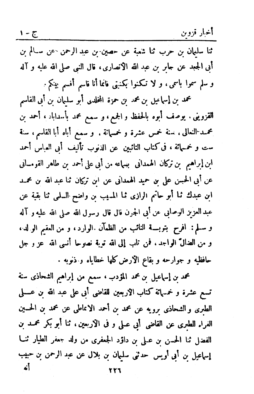 مُحَمَّد بْن إسماعيل بْن مُحَمَّد بْن حمزة المخلدي أبو سليمان بْن أبي القاسم القزويني يوصف أبوه بالحفظ والجمع وسمع مُحَمَّد بأسداباد أَحْمَد بْن مُحَمَّد النعالي سنة خمس عشرة وخمسمائة وسمع أباه أبا القاسم سنة ست وخمسمائة في كتاب التائبين عن الذنوب تأليف أبي العباس أحمد ابن إبراهيم بْن تركان الهمداني بِسَمَاعِهِ مِنْ أَبِي عَلِيٍّ أَحْمَدَ بْنِ طَاهِرٍ الْقُومَسَانِيِّ عَنْ أَبِي الْحَسَنِ عَلِيِّ بْنِ حُمَيْدٍ الْهَمْدَانِيِّ عَنِ ابْنِ تُرْكَانَ ثَنَا عَبْدُ اللَّهِ بن محمد ابن عَبْدَكَ ثَنَا أَبُو حَاتِمٌ الرَّازِيُّ ثَنَا الْمُسَيَّبُ بْنُ وَاضِحٍ السُّلَمِيُّ ثَنَا بَقِيَّةُ عَنْ عَبْدِ الْعَزِيزِ الْوَصَّابِيِّ عَنْ أَبِي الْجَوْنِ قَالَ قَالَ رَسُولُ اللَّهِ صَلَّى اللَّهُ عَلَيْهِ وَآلِهِ وَسَلَّمَ: "أَفَرْحُ بِتَوْبَةِ التَّائِبِ مِنَ الظَّمْآنِ الْوَارِدِ وَمِنَ العقيم الولد وَمِنَ الضَّالِّ الْوَاجِدِ فَمَنْ تَابَ إِلَى اللَّهِ تَوْبَةً نَصُوحًا أَنْسَى اللَّهُ عَزَّ وَجَلَّ حَافِظَيْهِ وَجَوَارِحَهُ وَبِقَاعَ الأَرْضِ كُلَّهَا خَطَايَاهُ وَذُنُوبُهُ".