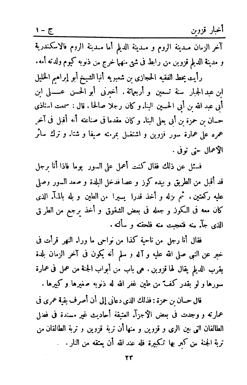 فَقَالَ: أَنَا رَجُلٌ مِنْ نَاحِيَةِ كَذَا مِنْ نَوَاحِي مَا وَرَاءِ النَّهْرِ قَرَأْتُ فِي خَبَرٍ عَنِ النَّبِيِّ صَلَّى اللَّهُ عَلَيْهِ وَسَلَّمَ: "أَنُّه يَكُونُ فِي آخِرِ الزَّمَانِ بَلْدَةٌ بِقُرْبِ الدَّيْلَمِ يُقَالُ لَهَا: قَزْوِينُ هِيَ بَابٌ مِنْ أَبْوَابِ الْجَنَّةِ مَنْ عَمِلَ فِي عِمَارَةِ سُورِهَا وَلَوْ بِقَدْرِ كَفٍّ مِنْ طِينٍ غَفَرَ اللَّهُ لَهُ ذُنُوبَهُ صَغِيرَهَا وَكَبِيرَهَا".