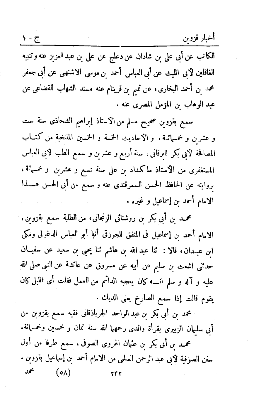 مُحَمَّد بْن أبي بكر بْن روشنائي الزنجاني من الطلبة سمع بقزوين الإمام أَحْمَد بْن إسماعيل في المتفق للجوزقي أَنْبَأَ أبو العباس الدغولي ومكي ابن عَبْدَانَ قَالا ثَنَا عَبْدُ اللَّهِ بْنُ هَاشِمٍ ثَنَا يَحْيَى بْنُ سَعِيدٍ عَنْ سُفْيَانَ حَدَّثَنِي أَشْعَثُ بْنُ سُلَيْمٍ عَنْ أَبِيهِ عَنْ مَسْرُوقٍ عَنْ عَائِشَةَ عَنِ النَّبِيِّ صَلَّى اللَّهُ عَلَيْهِ وَآلِهِ وَسَلَّمَ أَنَّهُ كَانَ يُعْجِبُهُ الدَّائِمُ مِنَ الْعَمَلِ فَقُلْتُ أَيُّ اللَّيْلِ كَانَ يَقُومُ قَالَتْ إِذَا سَمِعَ الصَّارِخَ يَعْنِي الدِّيكَ.