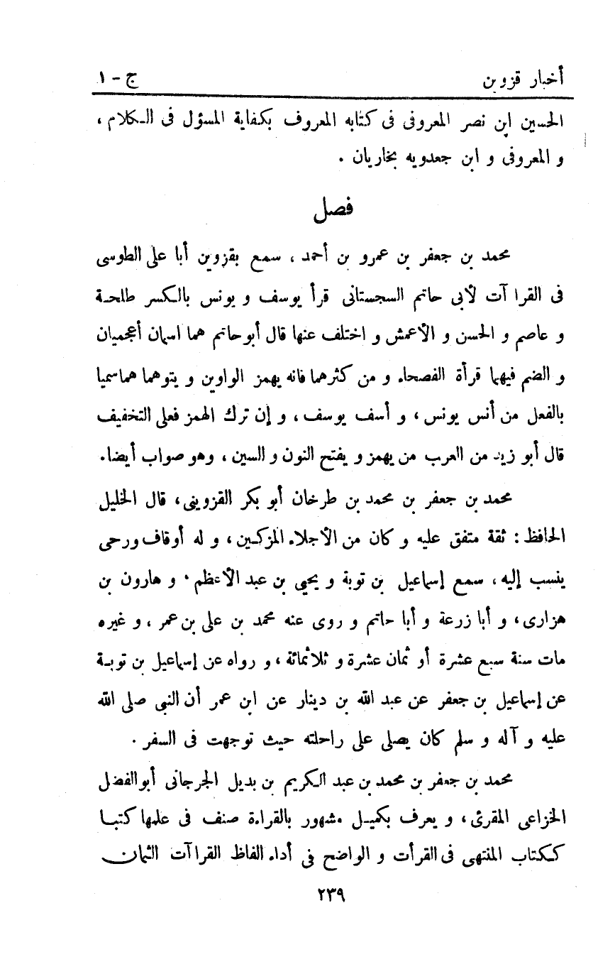 محمد بْن جعفر بْن عمرو بْن أَحْمَدَ سمع بقزوين أبا على الطوسي في القراآت لأبي حاتم السجستاني قرأ يوسف ويونس بالكسر طلحة وعاصم والحسن والأعمش واختلف عنها قَالَ أبو حاتم هما اسمان أعجميان والضم فيهما قرأة الفصحاء ومن كثرهما فإنه يهمز الواوين ويتوهما هماسميا بالفعل من أنس يونس وأسف يوسف وإن ترك الهمز فعلى التخفيف قَالَ أبو زيد من العرب من يهمز ويفتح النون والسين وهو صواب أيضا.