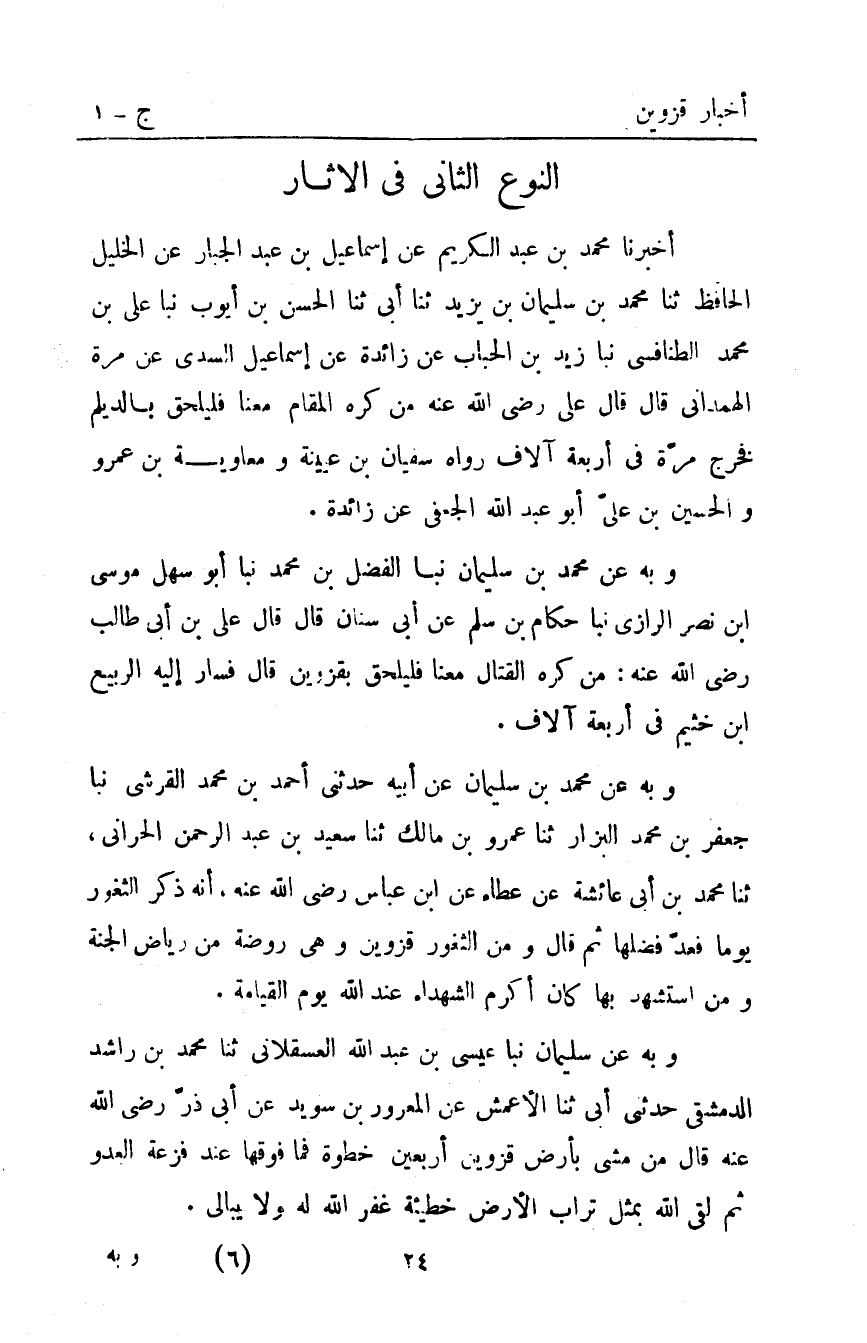 وَبِهِ عَنْ مُحَمَّدِ بْنِ سُلَيْمَانَ نَبَّأَ الْفَضْلُ بْنُ مُحَمَّدٍ نَبَا أبو سهل موسى ابن نَصْرٍ الرَّازِيُّ نَبَّأَ حَكَّامُ بْنُ سَلْمٍ عَنْ أَبِي سِنَانٍ قَالَ: قَالَ عَلِيُّ بْنُ أَبِي طَالِبٍ رَضِيَ اللَّهُ عَنْهُ مَنْ كَرِهَ الْقِتَالَ مَعَنَا فَلْيَلْحَقْ بِقَزْوِينَ قَالَ: فسار إليه الربيع ابن خَثْيَمٍ فِي أَرْبَعَةِ آلافٍ.