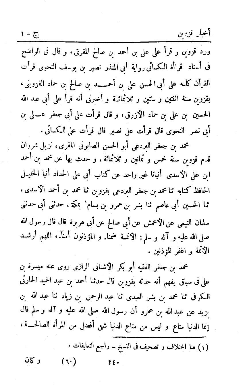 مُحَمَّد بْن جعفر البردعي أبو الحسن الصابوني المقري نزيل شروان قدم قزوين سنة خمس وثمانين وثلاثمائة وحدث بها عن مُحَمَّد بْن أحمد ابن علي الأسدي أَنْبَأَنَا غَيْرُ وَاحِدٍ عن كتاب أبي علي الحداد أَنْبَأَ الْخَلِيلُ الْحَافِظُ كُتَّابَهُ ثَنَا مُحَمَّدُ بْنُ جَعْفَرٍ الْبَرْدَعِيُّ بِقَزْوِينَ ثَنَا مُحَمَّدُ بْنُ أَحْمَدَ الأَسْدِيُّ ثنا الحسين أبي عَاصِمٍ ثَنَا بِشْرُ بْنُ عَمْرِو بْنِ بَسَّامٍ1 بِمَكَّةَ حَدَّثَنِي أَبِي حَدَّثَنِي سَلْمَانُ التَّيْمِيُّ عَنِ الأَعْمَشِ عَنْ أَبِي صَالِحٍ عَنْ أَبِي هُرَيْرَةَ قَالَ: قَالَ رَسُولُ اللَّهِ صَلَّى اللَّهُ عَلَيْهِ وَآلِهِ وَسَلَّمَ: "الأَئِمَةُ ضُمَنَاءُ وَالْمُؤَذِّنُونَ أُمَنَاءُ اللَّهُمَّ أَرْشِدِ الأَئِمَّةَ وَاغْفِرْ لِلْمُؤَذِّنيِنَ".