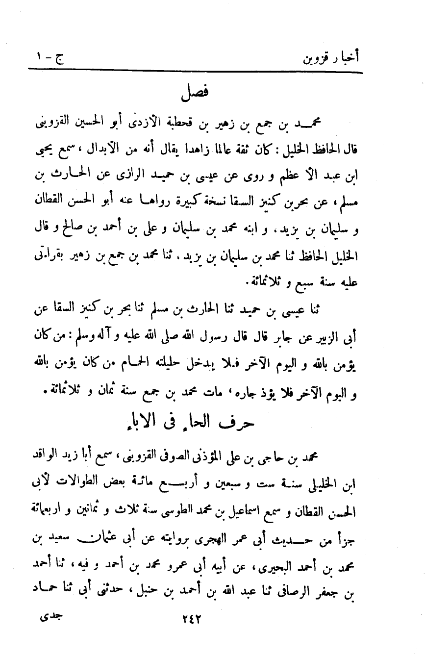 ثنا عِيسَى بْنُ حُمَيْدٍ ثنا الْحَارِثُ بْنُ مُسْلِمٍ ثنا بَحْرُ بْنُ كَنِيزٍ السَّقَّا عَنْ أَبِي الزُّبَيْرِ عَنْ جَابِرٍ قَالَ قَالَ رَسُولُ اللَّهِ صَلَّى اللَّهُ عَلَيْهِ واله وَسَلَّمَ: "مَنْ كَانَ يُؤْمِنُ بِاللَّهِ وَالْيَوْمِ الآخِرِ فَلا يُدْخِلْ حَلِيلَتَهُ الْحَمَّامَ مَنْ كَانَ يُؤْمِنُ بِاللَّهِ وَالْيَوْمِ الآخِرِ فَلا يُؤْذِ جَارَهُ". مات مُحَمَّد بْن جمع سنة ثمان وثلاثمائة