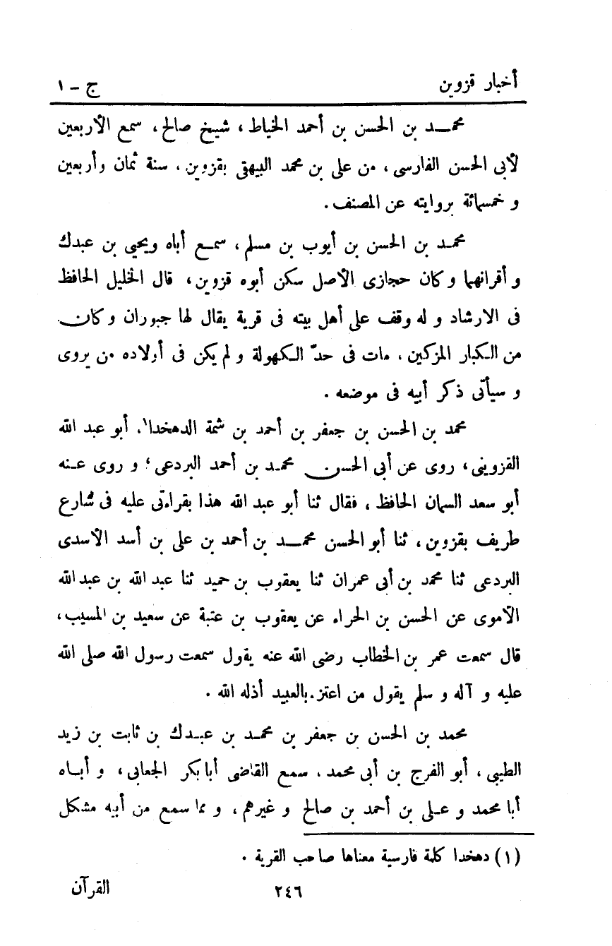 مُحَمَّد بْن الحسن بْن جعفر بْن أَحْمَدَ بْن شمة الدهخدا1 أبو عَبْد اللَّه القزويني روى عن أبي الحسن مُحَمَّد بْن أَحْمَدَ البردعي وَرَوَى عَنْهُ أَبُو سَعْدٍ السَّمَّانُ الْحَافِظُ فَقَالَ: ثَنَا أَبُو عَبْدِ اللَّهِ هَذَا بِقَرَاءَتِي عَلَيْهِ فِي شَارِعٍ طَرِيفٍ بِقَزْوِينَ ثَنَا أَبُو الْحَسَنِ مُحَمَّدُ بْن أَحْمَدَ بْن علي بْن أَسَدٍ الأَسْدِيُّ الْبَرْدَعِيُّ ثَنَا مُحَمَّدُ بْنُ أَبِي عِمْرَانَ ثَنَا يَعْقُوبُ بْنُ حُمَيْدٍ ثَنَا عَبْدُ اللَّهِ بْنُ عَبْدِ اللَّهِ الأُمَوِيُّ عَنِ الْحَسَنِ بْنِ الْحَرَّاءِ عَنْ يَعْقُوبَ بْنِ عُتْبَةَ عَنْ سَعِيدِ بْنِ الْمُسَيِّبِ قَالَ سَمِعْتُ عُمَرَ بْنَ الْخَطَّابِ رَضِيَ اللَّهُ عَنْهُ يَقُولُ سَمِعْتُ رَسُولَ اللَّهِ صَلَّى اللَّهُ عليه وسلم يَقُولُ: "مَنِ اعْتَزَّ بِالْعَبِيدِ أَذَلَّهُ اللَّهُ".
