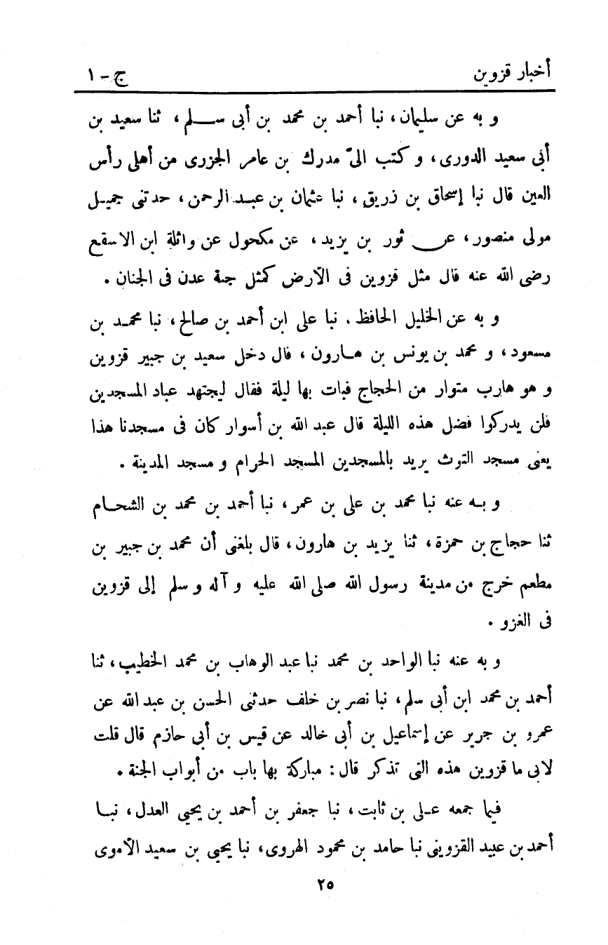 وَبِهِ عَنْ سُلَيْمَانَ نَبَّأَ أَحْمَدُ بْنُ مُحَمَّدِ بْنِ أَبِي سَلْمٍ ثَنَا سَعِيدُ بْنُ أَبِي سَعِيدٍ الدُّورِيُّ وَكَتَبَ إِلَى مُدْرِكِ بْنِ عَامِرٍ الْجَزَرِيِّ مِنْ أَهْلِ رَأْسِ الْعَيْنِ قَالَ نَبَّأَ إِسْحَاقُ بْنُ زُرَيْقٍ نَبَّأَ عُثْمَانُ بْنُ عَبْدِ الرَّحْمَنِ حَدَّثَنِي جَمِيلٌ مَوْلَى مَنْصُورٍ عَنْ ثَوْرِ بْنِ يَزِيدَ عَنْ مكحول عن واثلة ابن الأَسْقَعِ رَضِيَ اللَّهُ عَنْهُ قَالَ: "مَثَلُ قَزْوِينَ فِي الأَرْضِ كَمَثَلِ جَنَّةِ عَدْنٍ فِي الْجِنَانِ".