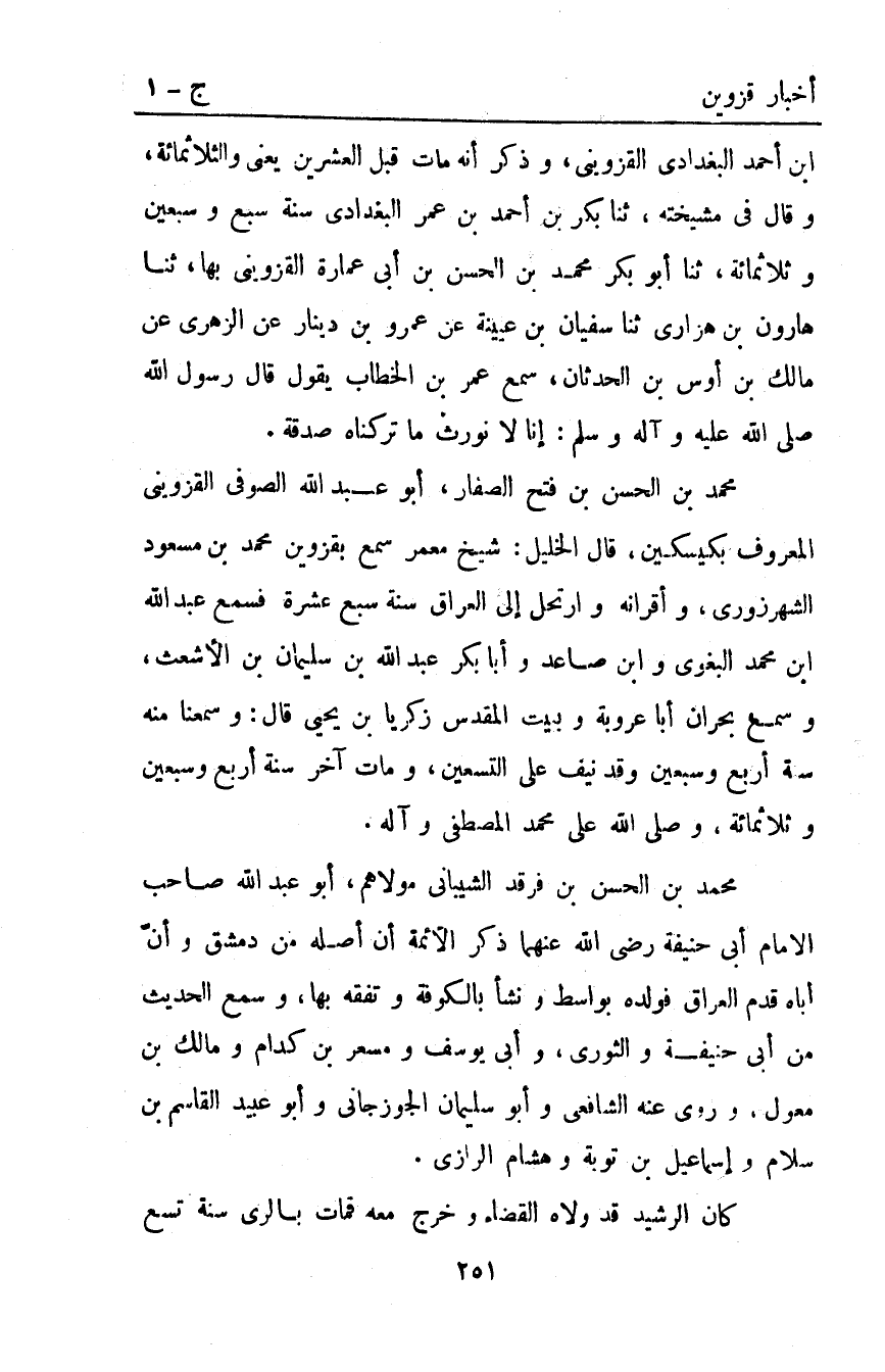 ابن أَحْمَد البغدادي القزويني وذكر أنه مات قبل العشرين يعني والثلاثمائة وقال في مشيخته ثَنَا بَكْرُ بْنُ أَحْمَدَ بْنِ عُمَرَ الْبَغْدَادِيُّ سنة سبع وسبعين وثلاثمائة ثَنَا أَبُو بَكْرٍ مُحَمَّدُ بْنُ الْحَسَنِ بْنِ أَبِي عُمَارَةَ الْقَزْوِينِيُّ بِهَا ثَنَا هَارُونُ بْنُ هَزَارِيٍّ ثَنَا سُفْيَانُ بْنُ عُيَيْنَةَ عَنِ عَمْرِو بْنِ دِينَارٍ عَنِ الزُّهْرِيِّ عَنْ مَالِكِ بْنِ أَوْسِ بْنِ الْحَدَثَانِ سَمِعَ عُمَرَ بْنَ الْخَطَّابِ يَقُولُ قَالَ رَسُولُ اللَّهِ صَلَّى الله عليه واله وَسَلَّمَ: "إِنَّا لا نُورَثُ, مَا تَرَكْنَاهُ صَدَقَةٌ".