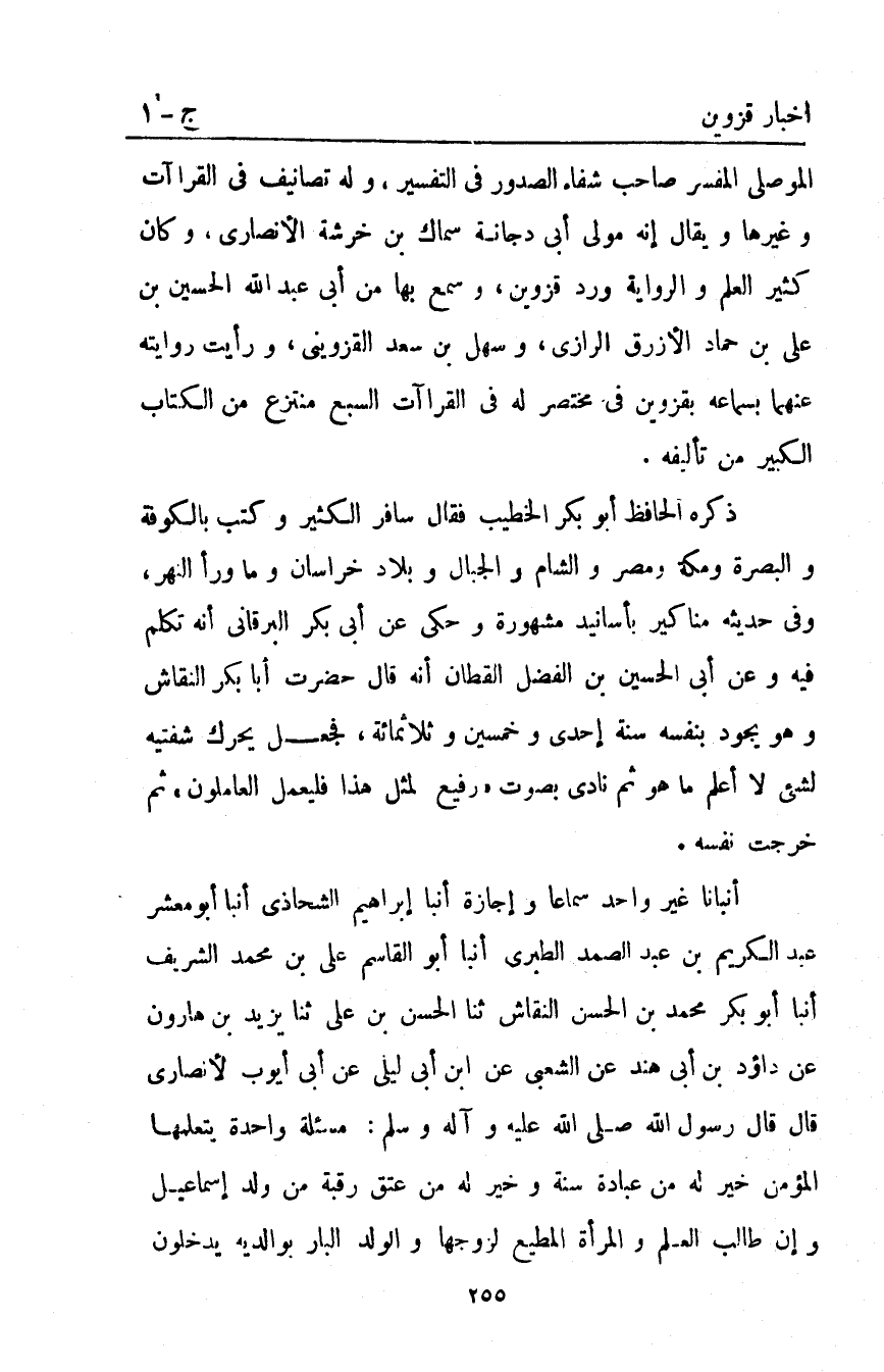 أَنْبَأَنَا غَيْرُ وَاحِدٍ سَمَاعًا وَإِجَازَةً أَنْبَا إِبْرَاهِيمُ الشَّحَّاذِيُّ أَنْبَأَ أَبُو مَعْشَرٍ عَبْدُ الْكَرِيمِ بْنُ عَبْدِ الصَّمَدِ الطَّبَرِيُّ أَنْبَأَ أَبُو الْقَاسِمِ عَلِيُّ بْنُ مُحَمَّدٍ الشَّرِيفُ أَنْبَأَ أَبُو بَكْرٍ مُحَمَّدُ بْنُ الْحَسَنِ النَّقَّاشُ ثَنَا الْحَسَنُ بْنُ عَلِيٍّ ثَنَا يَزِيدُ بن هارون عن داؤد بْنِ أَبِي هِنْدٍ عَنِ الشَّعْبِيِّ عَنِ ابْنِ أَبِي لَيْلَى عَنْ أَبِي أَيُّوبَ الأَنْصَارِيِّ قَالَ قَالَ رَسُولُ اللَّهِ صَلَّى اللَّهُ عَلَيْهِ واله وَسَلَّمَ: "مَسْأَلَةٌ وَاحِدَةٌ يَتَعَلَّمَهَا الْمُؤْمِنُ خَيْرٌ لَهُ مِنْ عِبَادَةٍ سَنَةٍ وَخَيْرٌ لَهُ مِنْ عِتْقِ رَقَبَةٍ مِنْ وَلَدِ إِسْمَاعِيلَ وَإِنَّ طَالِبَ الْعِلْمِ وَالْمَرْأَةَ الْمُطِيعَ لِزَوْجِهَا وَالْوَلَدَ البار بوالديه يدخلون