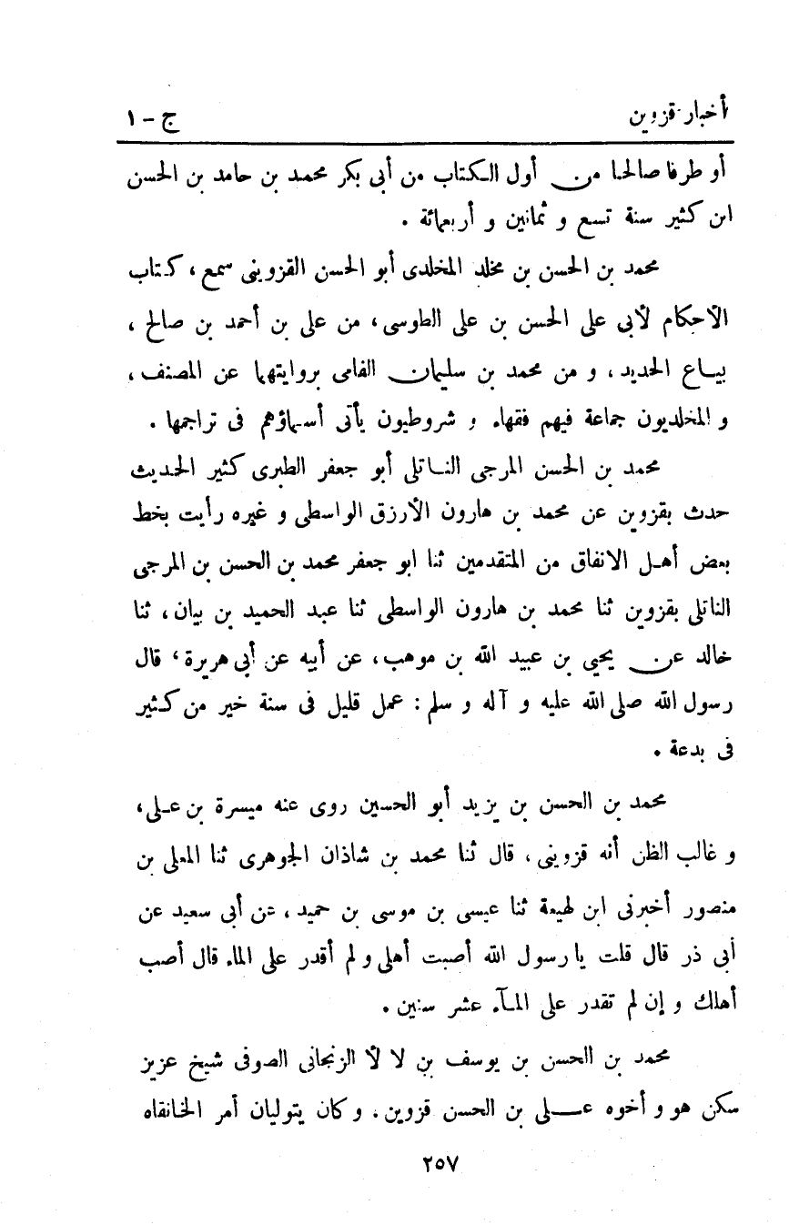 مُحَمَّد بْن الحسن المرجي الناتلي أبو جعفر الطبري كثير الحديث حدث بقزوين عن مُحَمَّد بْن هارون الأرزق الواسطي وغيره رأيت بخط بعض أهل الإنفاق من المتقدمين ثَنَا أَبُو جَعْفٍر مُحَمَّدُ بْنُ الْحَسَنِ بْنِ الْمَرْجِيِّ النَّاتِلِيُّ بِقَزْوِينَ ثَنَا مُحَمَّدُ بْنُ هَارُونَ الْوَاسِطِيُّ ثَنَا عَبْدُ الْحَمِيدِ بْنُ بَيَانٍ ثَنَا خَالِدٌ عَنْ يَحْيَى بْنِ عُبَيْدِ اللَّهِ بْنِ مَوْهَبٍ عَنْ أَبِيهِ عَنْ أَبِي هُرَيْرَةَ قَالَ رَسُولُ اللَّهِ صَلَّى اللَّهُ عَلَيْهِ وَآلِهِ وَسَلَّمَ: "عَمَلٌ قَلِيلٌ فِي سُنَّةٍ خَيْرٌ مِنْ كَثِيرٍ فِي بِدْعَةٍ".
