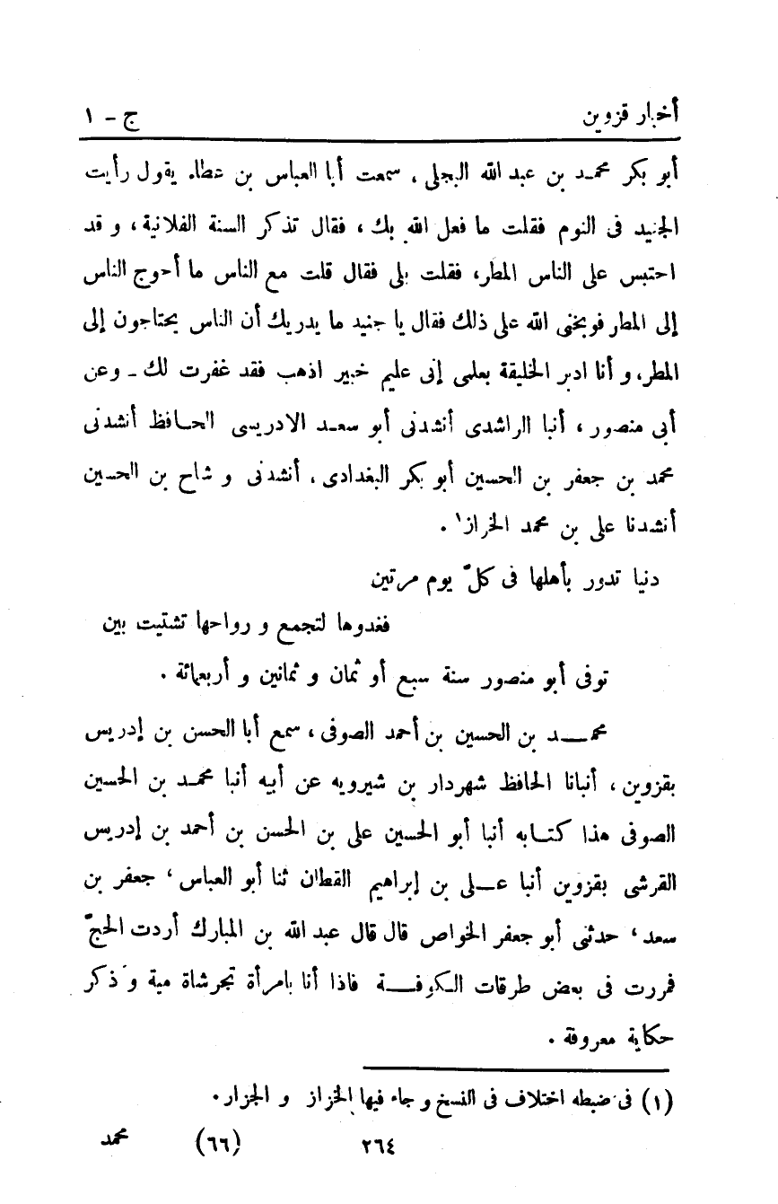 مُحَمَّد بْن الحسين بْن أَحْمَدَ الصوفي سمع أبا الحسن بْن إدريس بقزوين أنبأنا الحافظ شهردار بْن شيرويه عن أبيه أنبا مُحَمَّد بْن الحسين الصوفي هذا كتابه أنبا أبو الحسين علي بْن الحسن بْن أَحْمَدَ بْن إدريس القرشي بقزوين أنبا علي بْن إبراهيم القطان ثنا أبو العباس جعفر بْن سعد حدثني أبو جعفر الخواص قَالَ قَالَ عبد الله بْن المبارك أردت الحج فمررت في بعض طرقات الكوفة فإذا أنا بامرأة تجرشاة مية وذكر حكاية معروقة.