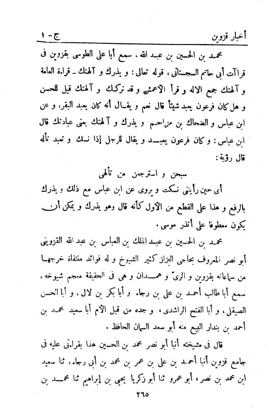 قَالَ في مشيخته: أَنْبَا أَبُو نَصْرٍ مُحَمَّدُ بْنُ الْحُسَيْنِ هَذَا بِقِرَاءَتِي عَلَيْهِ فِي جَامِعِ قَزْوِينَ أَنْبَا أَحْمَدُ بْنُ عَلِيِّ بْنِ عُمَرَ بْنِ مُحَمَّدِ بْنِ أَبِي رَجَاءٍ ثنا سعيد ابن مُحَمَّدِ بْنِ نَصْرٍ أَبُو عَمْرٍو ثنا أبو زكريا يحيى بْن إبراهيم ثنا محمد بن