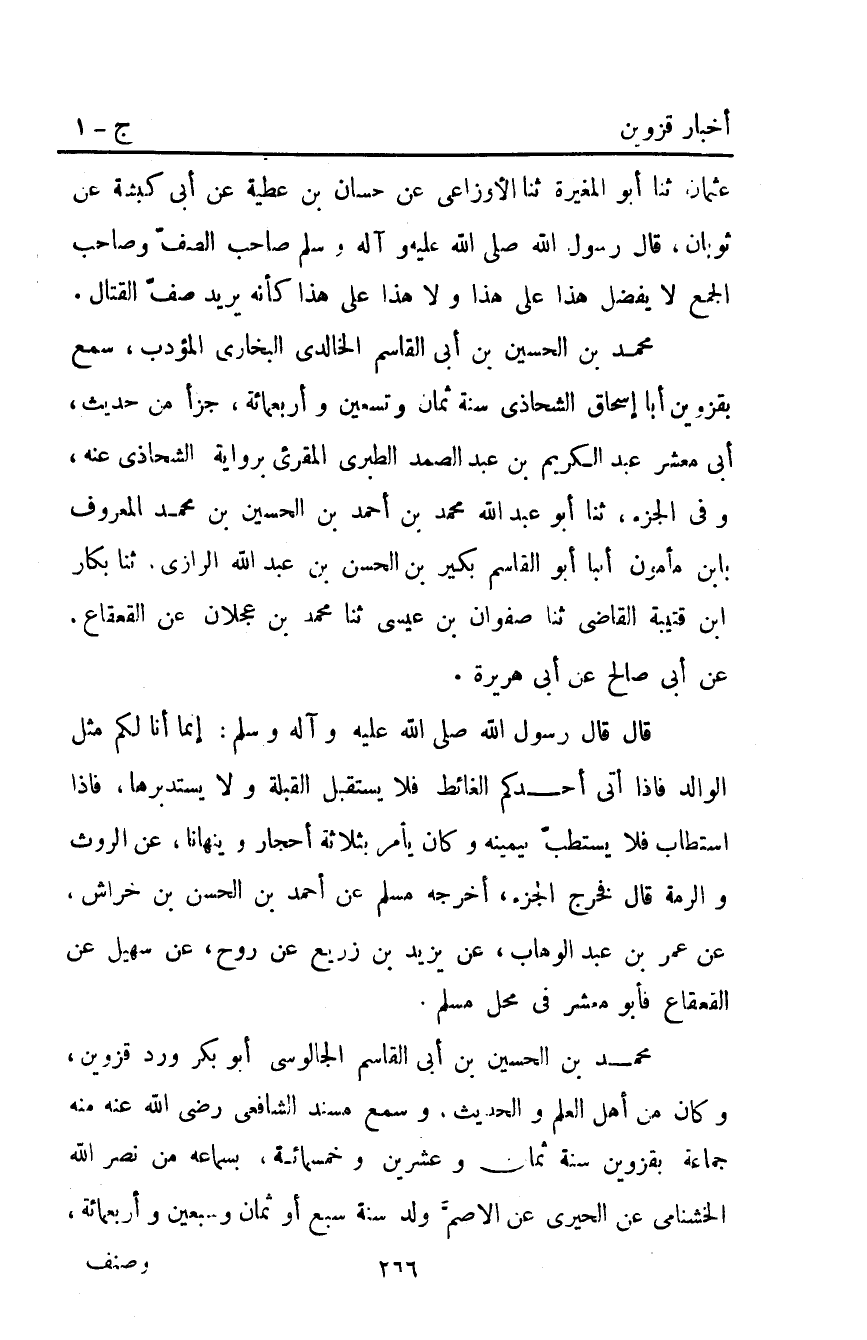 مُحَمَّد بْن الحسين بْن أبي القاسم الخالدي البخاري المؤدب سمع بقزوين أبا إسحاق الشحاذي سنة ثمان وتسعين وأربعمائة جزأ من حديث أبي معشر عبد الكريم بن عبد الصمد الطبري المقرىء برواية عنه وفي الجزء ثَنَا أَبُو عبد الله مُحَمَّد بْن أَحْمَدَ بْن الحسين بْنِ مُحَمَّدٍ الْمَعْرُوفُ بِابْنِ مَأْمُونٍ أَنْبَا أَبُو الْقَاسِمِ بُكَيْرُ بْنُ الحسن بن عبد الله الرازي ثنا بكار ابن قُتَيْبَةَ الْقَاضِي ثَنَا صَفْوَانُ بْنُ عِيسَى ثَنَا مُحَمَّدُ بْنُ عَجْلانَ عَنِ الْقَعْقَاعِ عَنْ أَبِي صَالِحٍ عَنْ أَبِي هُرَيْرَةَ.