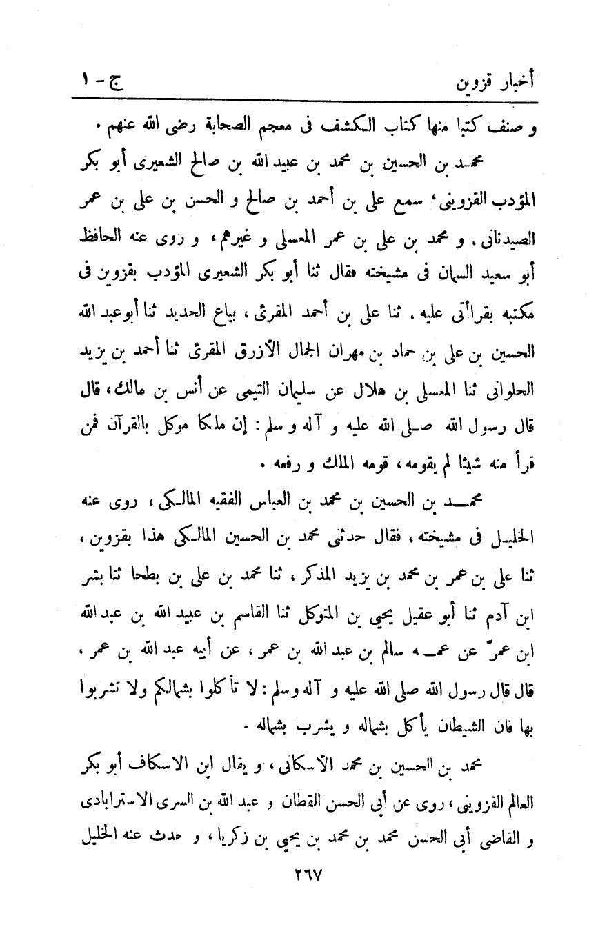 مُحَمَّد بْن الحسين بْن مُحَمَّد بْن العباس الفقيه المالكي روى عنه الخليل في مشيخته فقال حَدَّثَنِي مُحَمَّدُ بْنُ الْحُسَيْنِ الْمَالِكِيُّ هَذَا بِقَزْوِينَ ثَنَا عَلِيُّ بْنُ عُمَرَ بْنِ مُحَمَّدِ بْنِ يَزِيدَ الْمُذَكَّرُ ثَنَا مُحَمَّدُ بْنُ عَلِيِّ بْنِ بَطْحَا ثنا بشر ابن آدَمَ ثَنَا أَبُو عُقَيْلٍ يَحْيَى بْنُ الْمُتَوَكِّلِ ثَنَا الْقَاسِمُ بْنُ عبيد الله بن عبد الله ابن عُمَرَ عَنْ عَمِّهِ سَالِمِ بْنِ عبد الله بن عمر عن أبيه عبد الله بْنِ عُمَرَ قَالَ قَالَ رَسُولُ اللَّهِ صَلَّى اللَّهُ عَلَيْهِ وَآلِهِ وَسَلَّمَ: "لا تَأْكُلُوا بِشِمَالِكُمْ وَلا تَشْرَبُوا بِهَا فَإِنَّ الشَّيْطَانَ يَأْكُلُ بِشِمَالِهِ وَيَشْرَبُ بِشِمَالِهِ".