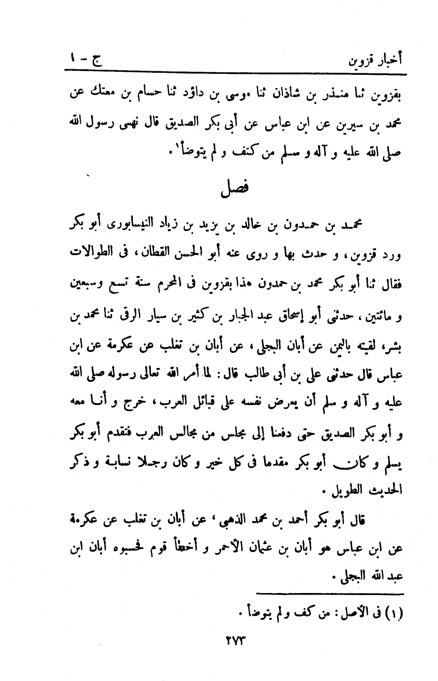 بِقَزْوِينَ ثَنَا مُنْذِرُ بْنُ شَاذَانَ ثنا موسى بن داؤد ثَنَا حُسَامُ بْنُ مَعْتَكٍ عَنْ مُحَمَّدِ بْنِ سِيرِينَ عَنِ ابْنِ عَبَّاسٍ عَنْ أَبِي بَكْرٍ الصِّدِّيقِ قال: نهسى رَسُولُ اللَّهِ صَلَّى اللَّهُ عَلَيْهِ وآله وَسَلَّمَ مِنْ كَتِفٍ وَلَمْ يَتَوَضَّأْ1.