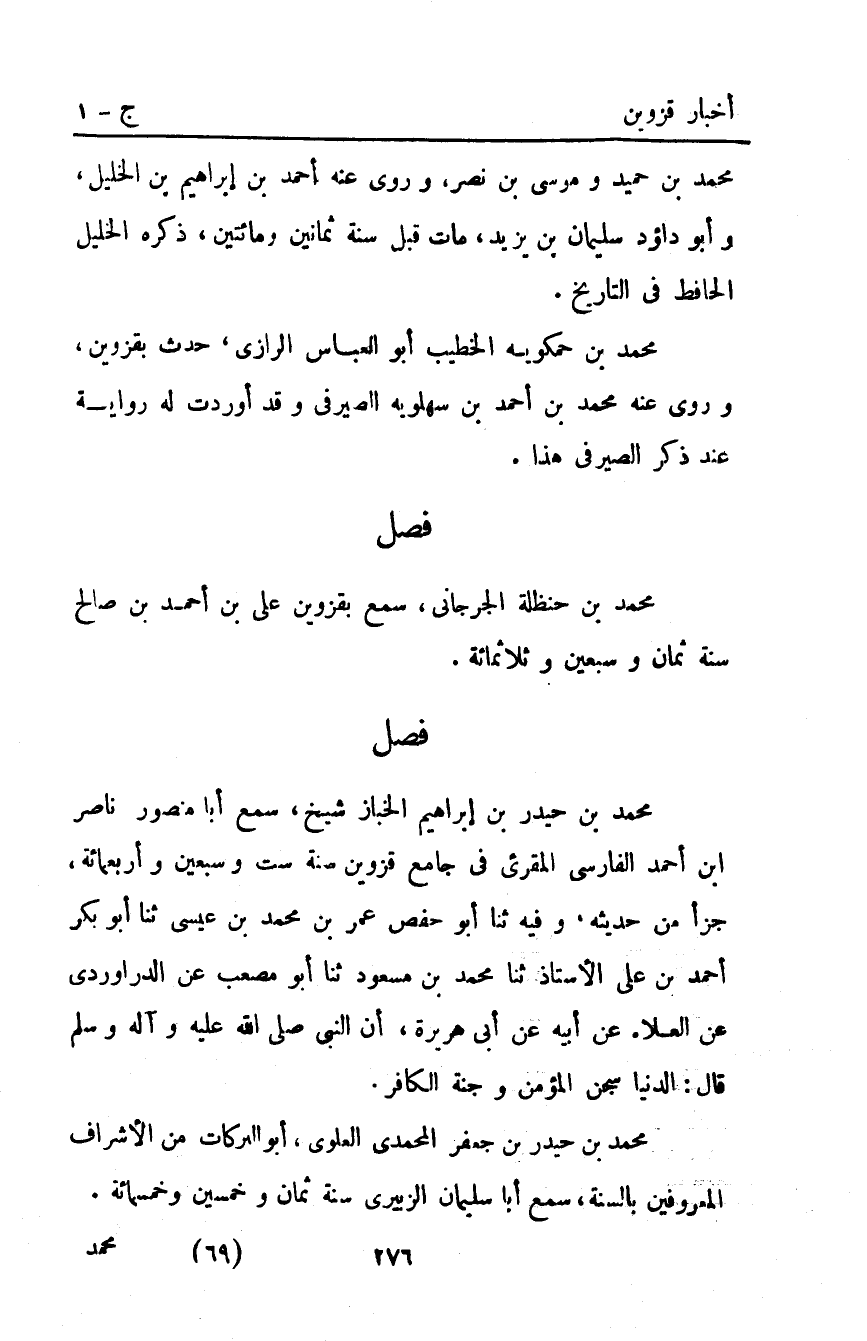 محمد بْن حيدر بْن إبراهيم الخباز شيخ سمع أبا منصور ناصر ابن أحمد الفارسي المقرىء في جامع قزوين سنة ست وسبعين وأربعمائة جزء من حديثه وفيه ثَنَا أَبُو حَفْصٍ عُمَرُ بْنُ مُحَمَّدِ بْنِ عِيسَى ثَنَا أَبُو بَكْرٍ أَحْمَدُ بْنُ عَلِيٍّ الأُسْتَاذُ ثَنَا مُحَمَّدُ بْنُ مَسْعُودٍ ثَنَا أَبُو مُصْعَبٍ عَنِ الدَّرَاوَرْدِيِّ عَنِ الْعَلاءِ عَنْ أَبِيهِ عَنْ أَبِي هُرَيْرَةَ أَنَّ النَّبِيَّ صَلَّى اللَّهُ عَلَيْهِ وآله وَسَلَّمَ قَالَ: "الدُّنْيَا سِجْنُ الْمُؤْمِنِ وَجَنَّةُ الْكَافِرِ".