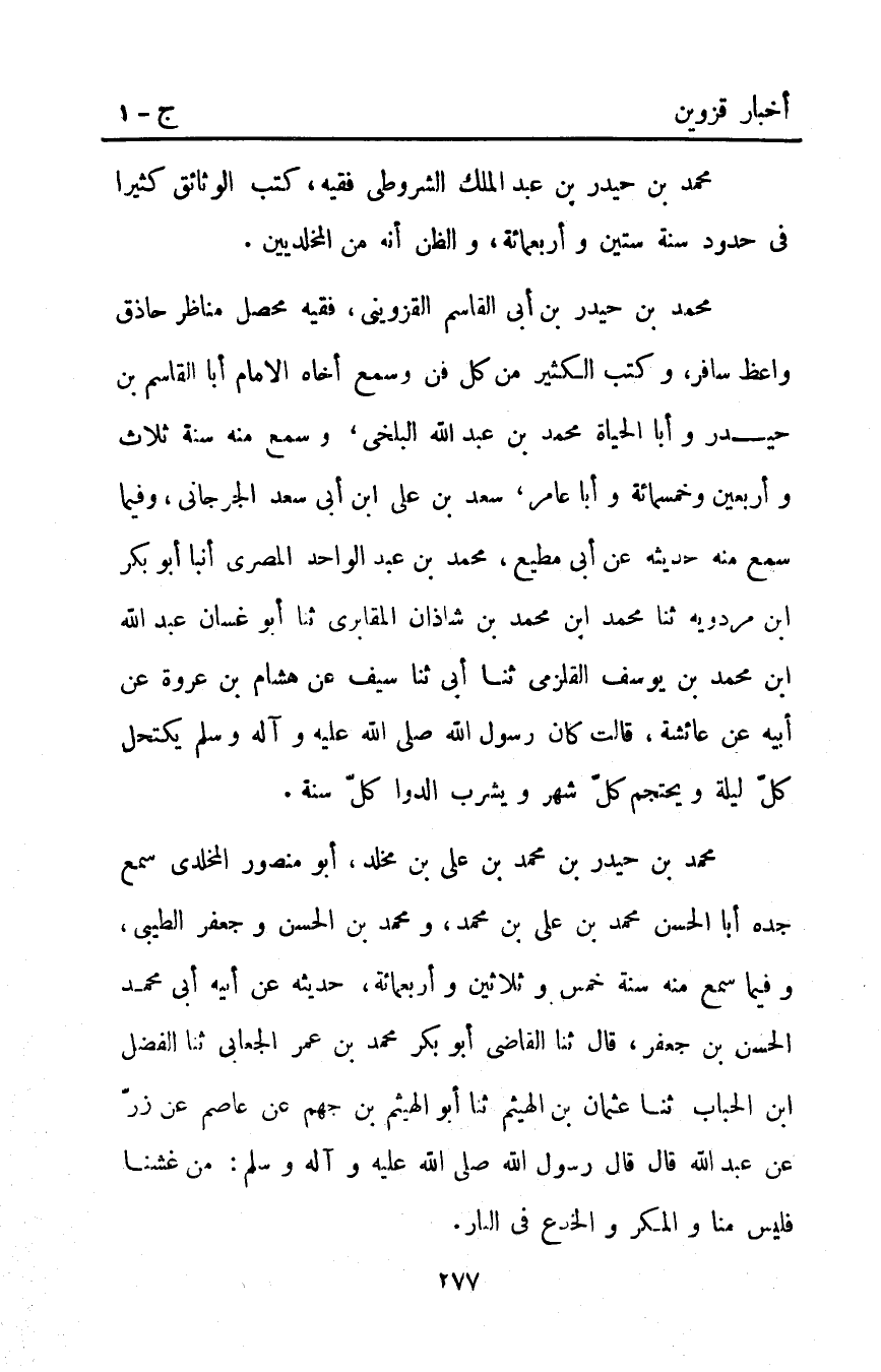 مُحَمَّد بْن حيدر بْن أبي القاسم القزويني فقيه محصل مناظر حاذق واعظ سافر وكتب الكثير من كل فن وسمع أخاه الإمام أبا القاسم بْن حيدر وأبا الحياة مُحَمَّد بْن عَبْد اللَّه البلخي وسمع منه سنة ثلاث وأربعين وخمسمائة وأبا عامر سعد بْن علي ابن أبي سعد الجرجاني وفيما سَمِعَ مِنْهُ حَدِيثَهُ عَنْ أَبِي مُطِيعٍ مُحَمَّدِ بْنِ عَبْدِ الْوَاحِدِ المصري أنبأ أبو بكر ابن مردويه ثنا محمد ابن مُحَمَّدِ بْنِ شَاذَانَ الْمَقَابِرِيُّ ثَنَا أبو غسان عبد الله ابن مُحَمَّدِ بْنِ يُوسُفَ الْقَلْزُمِيُّ ثَنَا أَبِي ثَنَا سَيْفٌ عَنْ هِشَامِ بْن عروة عن أبيه عن عَائِشَةَ قَالَتْ كَانَ رَسُولُ اللَّهِ صَلَّى اللَّهُ عَلَيْهِ وَآلِهِ وَسَلَّمَ يَكْتَحِلُ كُلَّ لَيْلَةٍ وَيَحْتَجِمُ كُلَّ شهر ويشرب الدوا كُلَّ سَنَةٍ.