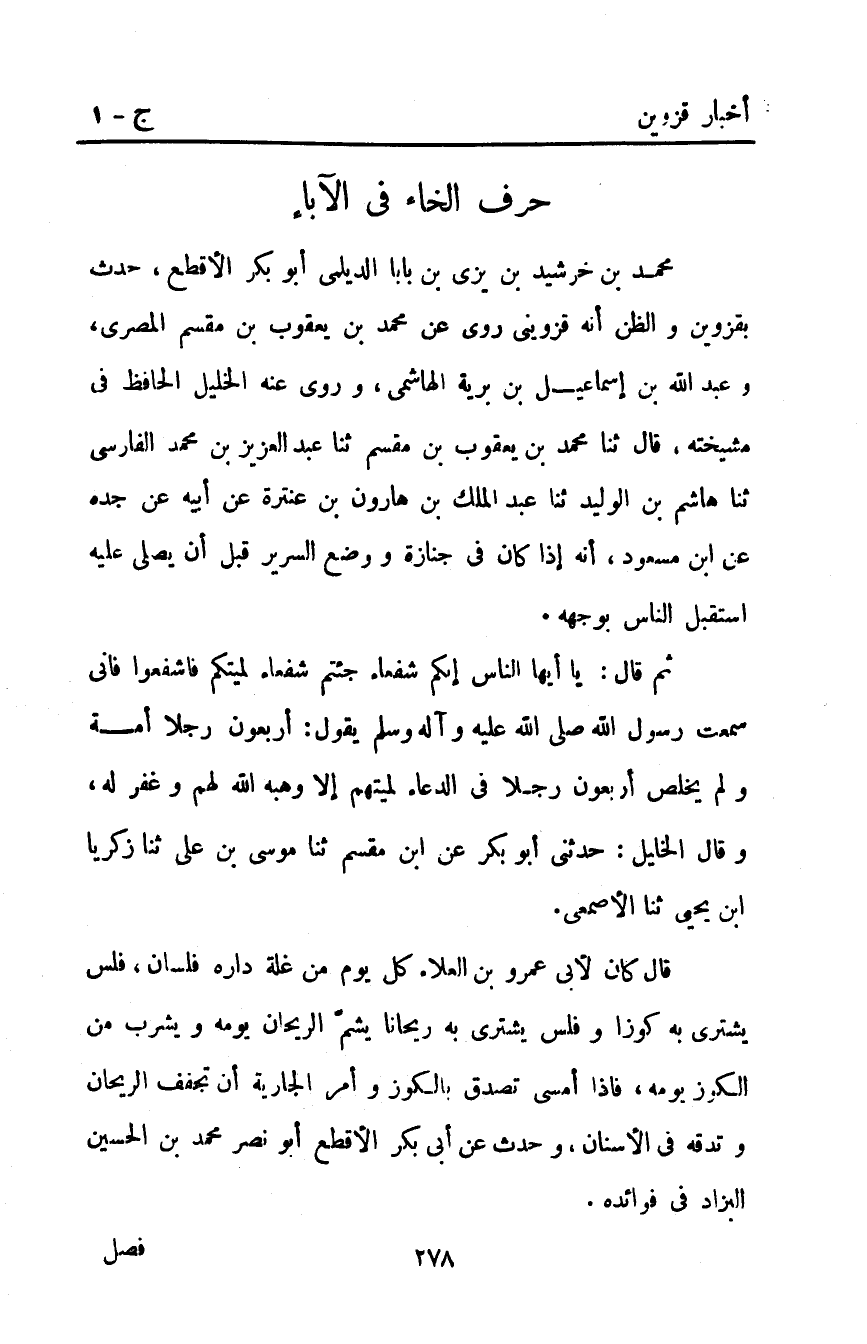 ثُمَّ قَالَ: يَا أَيُّهَا النَّاسُ إِنَّكُمْ شُفَعَاءٌ جِئْتُمْ شُفَعَاءَ لِمَيِّتِكُمْ فَاشْفَعُوا فَإِنِّي سَمِعْتُ رَسُولَ اللَّهِ صَلَّى اللَّهُ عليه وآله وَسَلَّمَ يَقُولُ: "أَرْبَعُونَ رَجُلا أُمَّةٌ وَلَمْ يُخْلِصْ أَرْبَعُونَ رَجُلا فِي الدُّعَاءِ لِمَيِّتِهِمْ إِلا وَهَبَهُ اللَّهُ لَهُمْ وَغَفَرَ لَهُ". وقال الخليل: حدثني أبو بكر عن ابن مقسم ثنا موسى بْن علي ثنا زكريا ابن يحيى ثنا الأصمعي.
