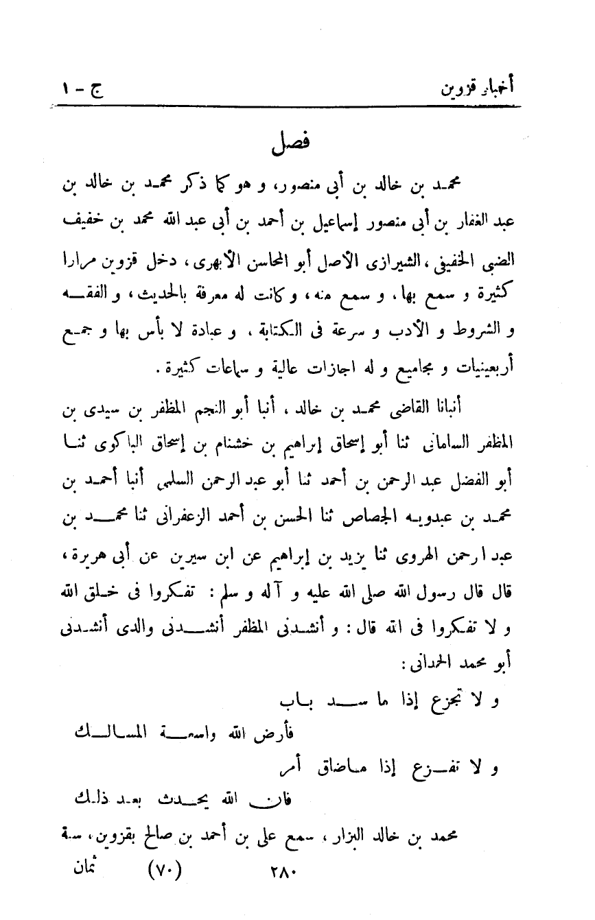 أَنْبَأَنَا الْقَاضِي مُحَمَّدُ بْنُ خَالِدٍ أَنْبَأَ أَبُو النَّجْمِ الْمُظَفَّرُ بْنُ سَيِّدِي بْنِ الْمُظَفَّرِ السَّامَانِيُّ ثَنَا أَبُو إِسْحَاقَ إِبْرَاهِيمُ بْنُ خُشْنَامَ بْنِ إِسْحَاقَ الْبَاكُوِيُّ ثَنَا أَبُو الْفَضْلِ عَبْدُ الرَّحْمَنِ بْنُ أَحْمَدَ ثَنَا أَبُو عَبْدِ الرَّحْمَنِ السُّلَمِيُّ أَنْبَأَ أَحْمَدُ بْنُ مُحَمَّدِ بْنِ عَبْدَوَيْهِ الْجَصَّاصُ ثَنَا الْحَسَنُ بْنُ أَحْمَدَ الزَّعْفَرَانِيُّ ثَنَا مُحَمَّدُ بْنُ عَبْدِ الرَّحْمَنِ الْهَرَوِيُّ ثَنَا يَزِيدُ بْنُ إِبْرَاهِيمَ عَنِ ابْنِ سِيرِينَ عَنْ أَبِي هُرَيْرَةَ قَالَ: قَالَ رَسُولُ اللَّهِ صَلَّى اللَّهُ عَلَيْهِ وآله وَسَلَّمَ: "تَفَكَّرُوا فِي خَلْقِ اللَّهِ وَلا تَفَكَّرُوا فِي اللَّهِ". قَالَ وأنشدني المظفر أنشدني والدي أنشدني أبو مُحَمَّد الحمداني:
