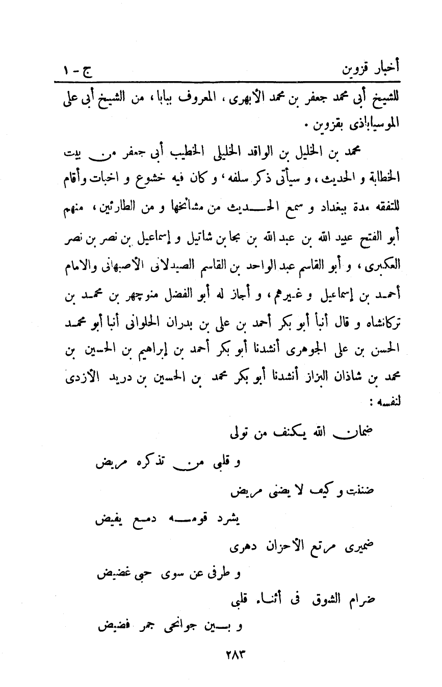 مُحَمَّد بْن الخليل بْن الواقد الخليلي الخطيب أبي جعفر من بيت الخطابة والحديث وسيأتي ذكر سلفه وكان فيه خشوع وإخبات وأقام للتفقه مدة ببغداد وسمع الحديث من مشائخها ومن الطارئين منهم أبو الفتح عبيد اللَّه بْن عَبْد اللَّه بْن نجا بْن شاتيل وإسماعيل بْن نصر بْن نصر العكبري وأبو القاسم عَبْد الواحد بْن القاسم الصيدلاني الأصبهاني والإمام أَحْمَد بْن إسماعيل وغيرهم وأجاز له أبو الفضل منوجهر بْن مُحَمَّد بْن تركانشاه وقال أنبأ أبو بكر أَحْمَد بْن علي بْن بدران الحلواني أنبأ أبو مُحَمَّد الحسن بْن علي الجوهري أنشدنا أبو بكر أَحْمَد بْن إبراهيم بْن الحسين بْن مُحَمَّد بْن شاذان البزاز أنشدنا أبو بكر مُحَمَّد بْن الحسين بْن دريد الأزدي لنفسه: