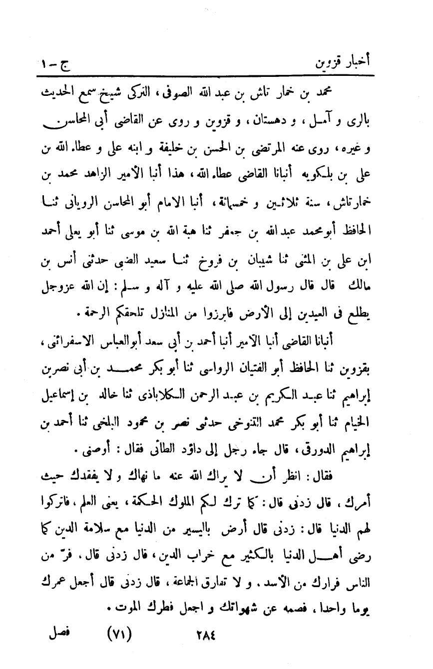 أَنْبَأَنَا الْقَاضِي أَنْبَأَ الأَمِيرُ أَنْبَأَ أَحْمَدُ بْنُ أَبِي سعد أبو العباس الأسفرائني بِقَزْوِينَ ثَنَا الْحَافِظُ أَبُو الْفِتْيَانِ الرَّوَّاسِيُّ ثَنَا أَبُو بَكْرٍ مُحَمَّدُ بْنُ أَبِي نَصْرِ بْنِ إِبْرَاهِيمَ ثَنَا عَبْدُ الْكَرِيمِ بْنُ عَبْدِ الرَّحْمَنِ الْكَلابَاذِيُّ ثَنَا خَالِدُ بْنُ إِسْمَاعِيلَ الْخَيَّامُ ثَنَا أَبُو بَكْرٍ مُحَمَّدُ التَّنُوخِيُّ حَدَّثَنِي نَصْرُ بْنُ مَحْمُودٍ الْبَلْخِيُّ ثَنَا أَحْمَدُ بْنُ إِبْرَاهِيمَ الدَّوْرَقِيُّ قَالَ: جَاءَ رَجُلٌ إلى داؤد الطَّائِيِّ فَقَالَ: أَوْصِنِي.
