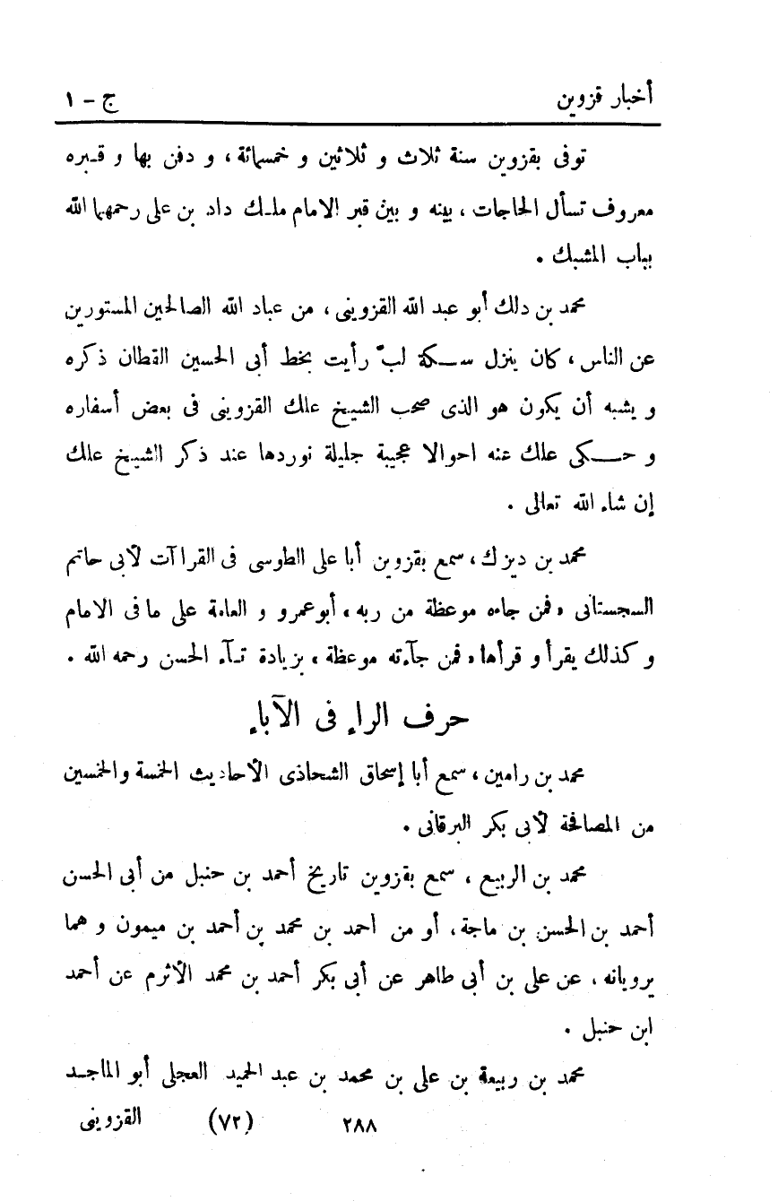 محمد بْن الربيع سمع بقزوين تاريخ أَحْمَد بْن حنبل من أبي الحسن أَحْمَد بْن الحسن بْن ماجة أو من أَحْمَد بْن مُحَمَّدُ بْنُ أَحْمَدَ بْنِ مَيْمُونٍ وهما يرويانه عن علي بْن أبي طاهر عن أبي بكر أَحْمَد بْن مُحَمَّد الأثرم عن أحمد ابن حنبل.