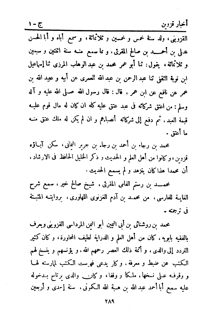 القزويني ولد سنة خمس وخمسين وثلاثمائة وسمع أباه وأبا الحسن علي بن أحمد بن صالح المقرىء ومما سمع منه سنة اثنتين وسبعين وثلاثمائة يقول: ثَنَا أَبُو عُمَرَ مُحَمَّدُ بن عبد الوهاب المرزي ثنا إسماعيل ابن تَوْبَةَ الثَّقَفِيُّ ثَنَا عَبْدُ الرَّحْمَنِ بْنُ عَبْدِ اللَّهِ الْعُمَرِيُّ عَنْ أَبِيهِ وَعُبَيْدُ اللَّهِ بْنُ عُمَرَ عَنْ نَافِعٍ عَنِ ابْنِ عُمَرَ قَالَ: قَالَ رَسُولُ اللَّهِ صَلَّى اللَّهُ عَلَيْهِ وَآلِهِ وَسَلَّمَ: "مَنْ أعتق شركائه فِي عَبْدٍ عُتِقَ عَلَيْهِ كُلِّهُ إِنْ كَانَ لَهُ مَالٌ قَوَّمَ عَلَيْهِ قِيمَةَ الْعَبْدِ ثُمَّ دَفَعَ إِلَى شُرَكَائِهِ أَنْصِبَاءَهُمْ وَإِنْ لَمْ يكن له ملك عَتَقَ مِنْهُ مَا أَعْتَقَ".