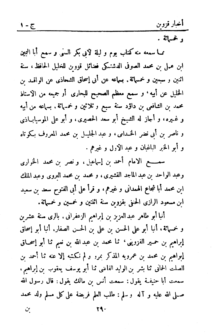 أَنْبَأَ أَبُو طَاهِرٍ عَبْدُ الْعَزِيزِ بْنُ إِبْرَاهِيمَ الزَّعْفَرَانِيُّ بِالرَّيِّ سَنَةَ عشرين وخمسمائة أَنْبَأَ أَبُو عَلِيٌّ الْحَسَنُ بْنُ عَلِيِّ بْنِ الْحَسَنِ الصَّفَّارُ أَنْبَأَ أَبُو إِسْحَاقَ إِبْرَاهِيمُ بْنُ حِمْيَرَ الْقَزْوِينِيُّ ثَنَا مُحَمَّدُ بْنُ عَبْدِ اللَّهِ بْنِ نُعَيْمٍ ثَنَا أَبُو إِسْحَاقَ إِبْرَاهِيمُ بْنُ مُحَمَّدِ بْنِ عَمْرَوَيْهِ الْمُذَكَّرُ بِمَرْوَ وَلَمْ نَكْتُبْهُ إِلا عَنْهُ ثَنَا أَحْمَدُ بْنُ الصَّلْتِ الْحِمَّانِيُّ ثَنَا بِشْرُ بْنُ الْوَلِيدِ الْقَاضِي ثَنَا أَبُو يُوسُفَ يَعْقُوبُ بْنُ إِبْرَاهِيمَ سَمِعْتُ أَبَا حَنِيفَةَ يَقُولُ: سَمِعْتُ أَنَسَ بْنَ مَالِكٍ يَقُولُ: قَالَ رَسُولُ اللَّهِ صَلَّى اللَّهُ عَلَيْهِ وَآلِهِ وَسَلَّمَ: "طَلَبُ الْعِلْمِ فَرِيضَةٌ عَلَى كُلِّ مسلم". ولد محمد