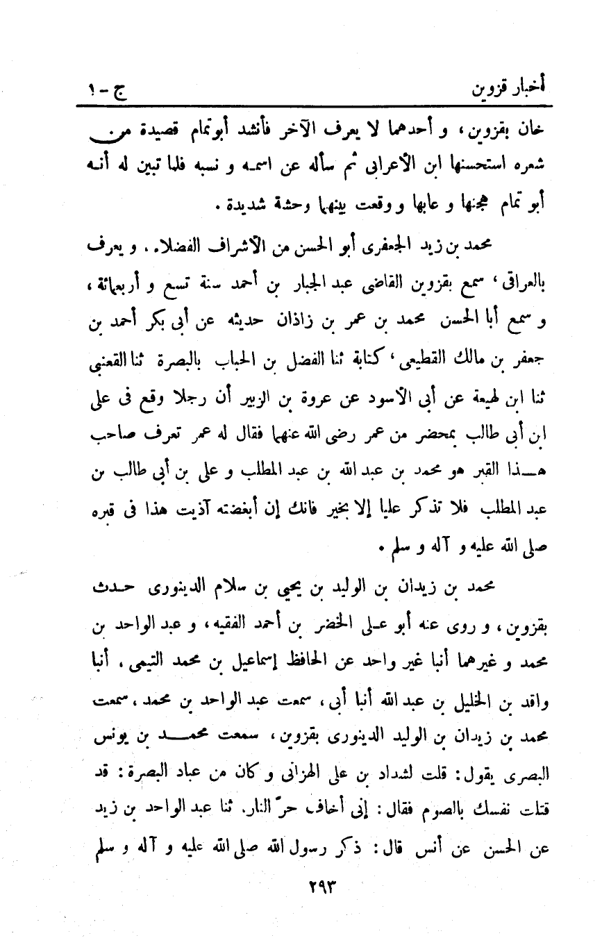 مُحَمَّد بْن زيد الجعفري أبو الحسن من الأشراف الفضلاء ويعرف بالعراقي سمع بقزوين القاضي عَبْد الجبار بْن أَحْمَدَ سنة تسع وأربعمائة وَسَمِعَ أَبَا الْحَسَنِ مُحَمَّدَ بْنَ عُمَرَ بْنِ زَاذَانَ حَدِيثَهُ عَنْ أَبِي بَكْرٍ أَحْمَدَ بْنِ جَعْفَرِ بْنِ مَالِكٍ القْطَيِعِيِّ كِتَابَةً ثنا الْفَضْلُ بْنُ الْحُبَابِ بِالْبَصْرَةِ ثنا القعنبي ثنا ابْنُ لَهِيعَةَ عَنْ أَبِي الأَسْوَدِ عَنْ عُرْوَةَ بْنِ الزُّبَيْرِ أَنَّ رَجُلا وَقَعَ فِي عَلِيِّ ابن أَبِي طَالِبٍ بِمَحْضَرٍ مِنْ عُمَرَ رَضِيَ اللَّهُ عَنْهُمَا فَقَالَ لَهُ عُمَرُ: تَعْرِفُ صَاحِبَ هَذَا الْقَبْرِ هُوَ مُحَمَّدُ بْنُ عَبْدِ اللَّهِ بْنِ عَبْدِ الْمُطَّلِبِ وَعَلِيُّ بْنُ أَبِي طَالِبِ بْنِ عَبْدِ الْمُطَّلِبِ فَلا تَذْكُرْ عَلِيًّا إِلا بِخَيْرٍ فَإِنَّكَ إِنْ أَبْغَضْتَهُ آذَيْتَ هَذَا فِي قَبْرِهِ صَلَّى اللَّهُ عَلَيْهِ وآله وسلم.