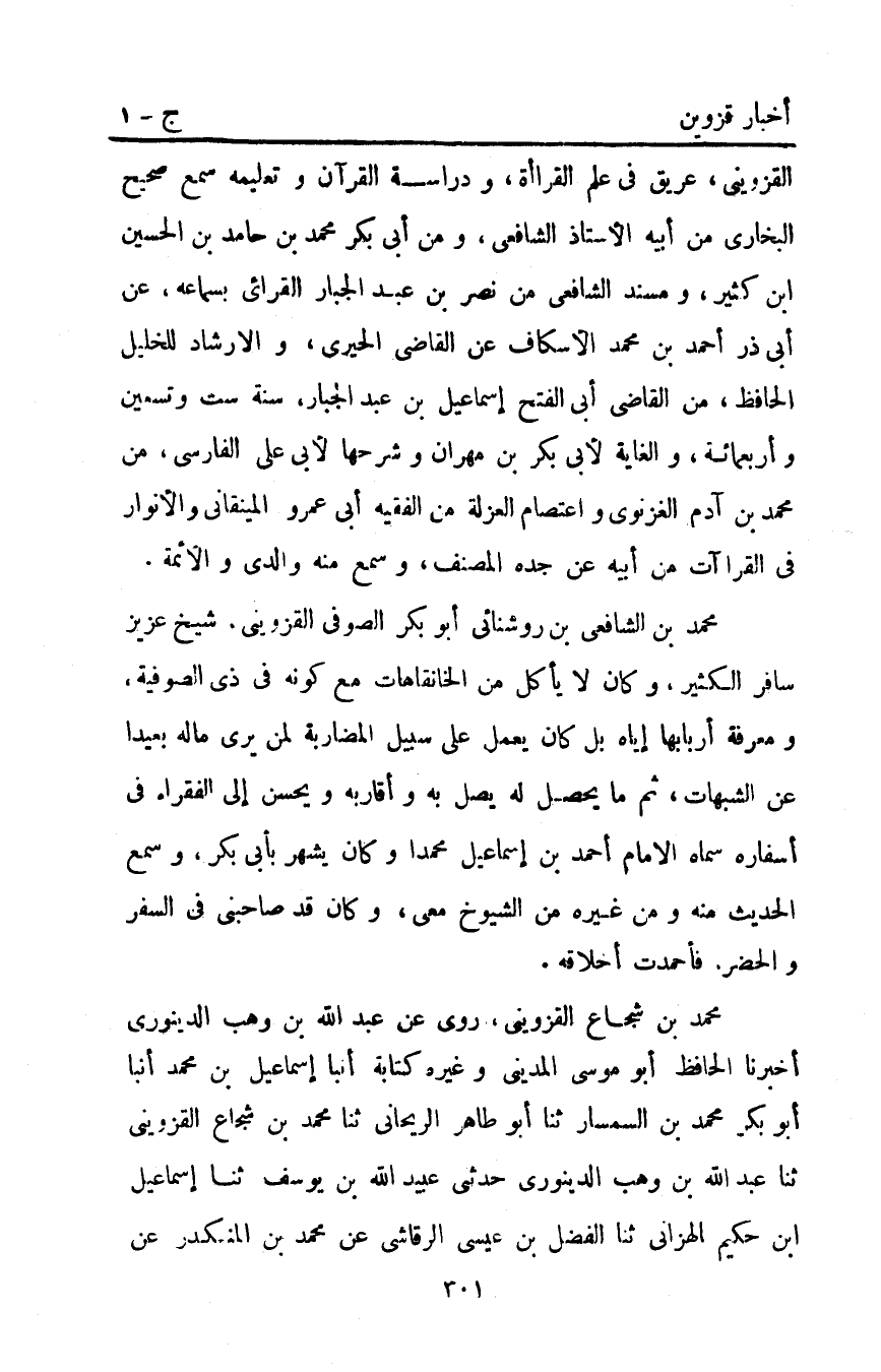 القزويني عريق في علم القراأة ودراسة القرآن وتعليمه سمع صحيح البخاري من أبيه الأستاذ الشافعي ومن أبي بكر مُحَمَّد بْن حامد بْن الحسين ابن كثير ومسند الشافعي من نصر بْن عبد الجبار القراىء بسماعه عن أبي ذر أَحْمَد بْن مُحَمَّد الأسكاف عن القاضي الحيري والإرشاد للخليل الحافظ من القاضي أبي الفتح إسماعيل بْن عَبْد الجبار سنة ست وتسعين وأربعمائة والغاية لأبي بكر بْن مهران وشرحها لأبي علي الفارسي من مُحَمَّد بْن آدم الغزنوي واعتصام العزلة من الفقيه أبي عمرو المينقاني والأنوار في القراآت من أبيه عن جده المصنف وسمع منه والدي والأئمة.