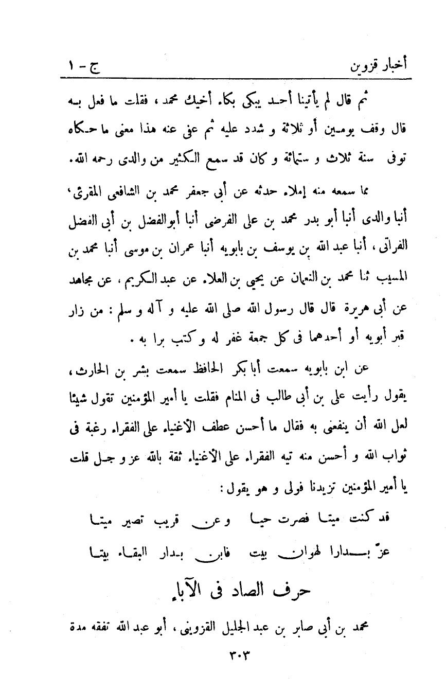 مما سمعه منه إملاء حدثه عَنْ أَبِي جعفر محمد بن الشافعي المقرىء أَنْبَأَ وَالِدِي أَنْبَأَ أَبُو بَدْرٍ مُحَمَّدُ بْنُ عَلِيٍّ الْفَرَضِيُّ أَنْبَأَ أَبُو الْفَضْلِ بْنُ أَبِي الْفَضْلِ الْفُرَاتِيُّ أَنْبَأَ عَبْدُ اللَّهِ بْنُ يُوسُفَ بْنِ بَابَوَيْهِ أَنْبَأَ عِمْرَانُ بْنُ مُوسَى أَنْبَأَ مُحَمَّدُ بْنُ الْمُسَيَّبِ ثَنَا مُحَمَّدُ بْنُ النُّعْمَانِ عَنْ يَحْيَى بْنِ الْعَلاءِ عَنْ عَبْدِ الْكَرِيمِ عَنْ مُجَاهِدٍ عَنْ أَبِي هُرَيْرَةَ قَالَ قَالَ رَسُولُ اللَّهِ صَلَّى اللَّهُ عَلَيْهِ وَآلِهِ وَسَلَّمَ: "مَنْ زَارَ قَبْرَ أَبَوَيْهِ أَوْ أَحَدِهِمَا فِي كُلِّ جُمُعَةٍ غُفِرَ لَهُ وَكُتِبَ بَرًّا بِهِ".