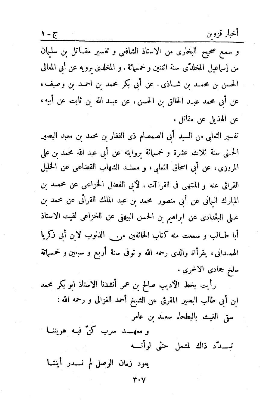 تفسير الثعلبي من السيد أبي الصمصام ذي الفقار بْن مُحَمَّد بْن معَبْد البصير الحسني سنة ثلاث عشرة وخمسمائة بروايته عن أبي عَبْد اللَّه مُحَمَّد بْن علي المروزي عن أبي إسحاق الثعلبي ومسند الشهاب القضاعي عن الخليل القرائي عنه والمنتهي في القراآت لأبي الفضل الخزاعي عن مُحَمَّد بْن المبارك اليماني عن أبي منصور مُحَمَّد بْن عَبْد الملك القرائي عن مُحَمَّد بْن علي البغدادي عن إبراهيم بْن الحسن البيهقي عن الخزاعي لقيت الأستاذ أبا طالب وسمعت منه كتاب الخائفين من الذنوب لابن أبي زكريا الهمداني بقرأة والدي رحمه اللَّه وتوفي سنة أربع وسبعين وخمسمائة سلخ جمادى الأخرى.