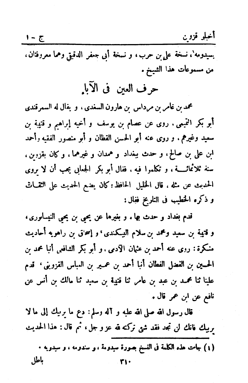 قدم بغداد وحدث بها وبغيرها عن يحيى بْن يحيى النيسابوري وقتيبة بْن سعيد ومحمد بْن سلام البيكندي وإسحاق بْن راهويه أحاديث منكرة رَوَى عَنْهُ أَحْمَدُ بْنُ عُثْمَانَ الآدَمِيُّ وَأَبُو بَكْرٍ الشَّافِعِيُّ أَنْبَأَ مُحَمَّدُ بْنُ الْحُسَيْنِ بْنِ الْفَضْلِ الْقَطَّانُ أَنْبَأَ أَحْمَدُ بْنُ عُمَيْرِ بْنِ الْعَبَّاسِ الْقَزْوِينِيُّ قَدِمَ عَلَيْنَا ثَنَا مُحَمَّدُ بْنُ عَبْدِ بْنِ عَامِرٍ ثَنَا قُتَيْبَةُ بْنُ سَعِيدٍ ثَنَا مَالِكٌ بْنُ أَنَسٍ عَنْ نَافِعِ عَنِ ابْنِ عُمَرَ قَالَ: