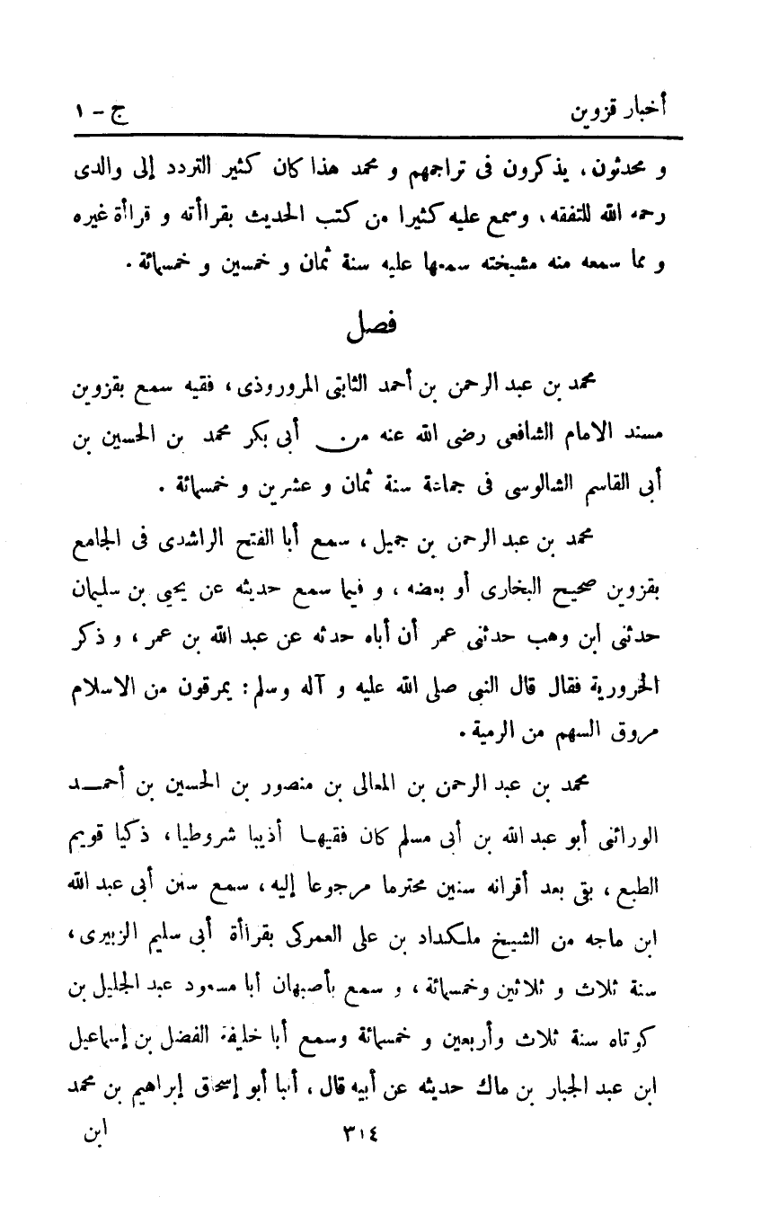 مُحَمَّدِ بْنِ عَبْدِ الرَّحْمَنِ بْنِ جميل سمع أبا الفتح الراشدي في الجامع بقزوين صحيح البخاري أو بعضه وفيما سَمِعَ حَدِيثَهُ عَنْ يَحْيَى بْنِ سُلَيْمَانَ حَدَّثَنِي ابْنُ وَهْبٍ حَدَّثَنِي عُمَرُ أَنَّ أَبَاهُ حَدَّثَهُ عَنْ عَبْدِ اللَّهِ بْنِ عُمَرَ وَذَكَرَ الْحَرُورِيَّةَ فَقَالَ: قَالَ النَّبِيُّ صَلَّى اللَّهُ عَلَيْهِ وآله وَسَلَّمَ: "يَمْرُقُونَ مِنَ الإِسْلامِ مُرُوقَ السَّهْمِ مِنَ الرَّمْيَةِ".