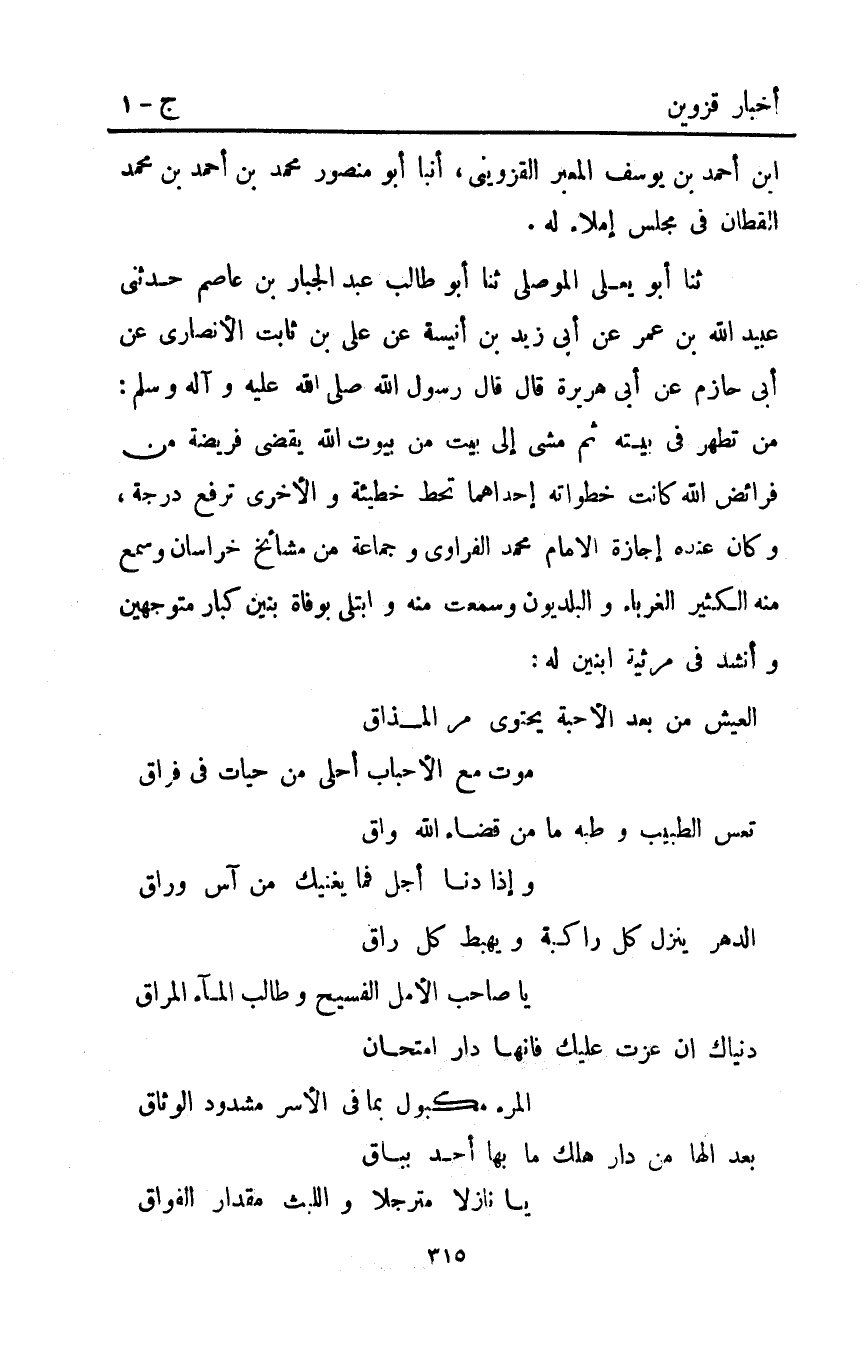 ابن أَحْمَدَ بْنِ يُوسُفَ الْمُعَبِّرُ الْقَزْوِينِيُّ أَنْبَأَ أَبُو مَنْصُورٍ مُحَمَّدُ بْنُ أَحْمَدَ بْنِ مُحَمَّدٍ الْقَطَّانُ فِي مَجْلِسٍ إِمْلاءً لَهُ.