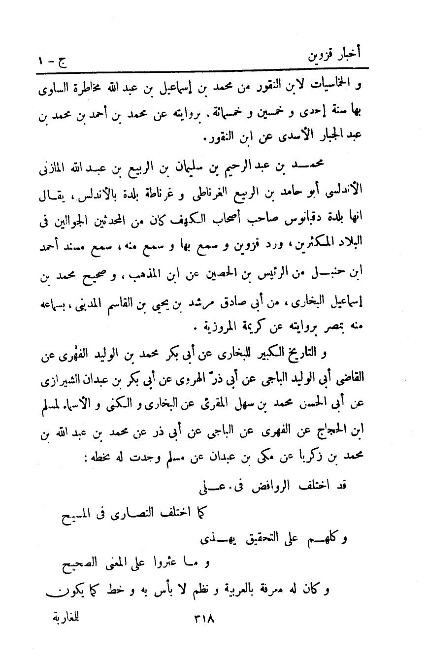 والتاريخ الكبير للبخاري عن أبي بكر مُحَمَّد بْن الوليد الفهري عن القاضي أبي الوليد الباجي عن أبي ذر الهروي عن أبي بكر بْن عبدان الشيرازي عن أبي الحسن مُحَمَّد بْن سهل المقرىء عن البخاري والكنى والأسماء لمسلم ابن الحجاج عن الفهري عن الباجي عن أبي ذر عن محمد بن عبد الله بْن مُحَمَّد بْن زكريا عن مكي بْن عبدان عن مسلم وجدت له بخطه: