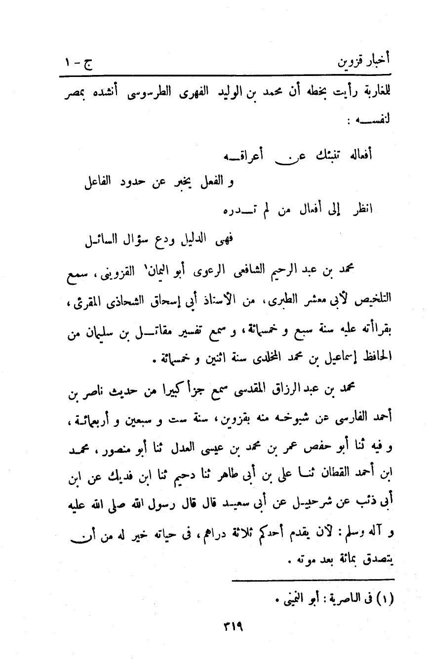 مُحَمَّد بْن عَبْد الرزاق المقدسي سمع جزأ كبيرا من حديث ناصر بْن أَحْمَدَ الفارسي عن شيوخه منه بقزوين سنة ست وسبعين وأربعمائة وفيه ثَنَا أَبُو حَفْصٍ عُمَرُ بْنُ مُحَمَّدِ بْنِ عِيسَى الْعَدْلُ ثنا أبو منصور محمد ابن أَحْمَدَ الْقَطَّانُ ثَنَا عَلِيُّ بْنُ أبي طاهر ثنا دحيم ابن فُدَيْكٍ عَنِ ابْنِ أَبِي ذِئْبٍ عَنْ شُرَحْبِيلَ عَنْ أَبِي سَعِيدٍ قَالَ: قَالَ رَسُولُ اللَّهِ صَلَّى الله عليه وآله وَسَلَّمَ: "لأَنْ يُقَدِّمَ أَحَدُكُمْ ثَلاثَةَ دَرَاهِمَ فِي حَيَاتِهِ خَيْرٌ لَهُ مِنْ أَنْ يَتَصَدَّقَ بِمِائَةٍ بَعْدَ موته"