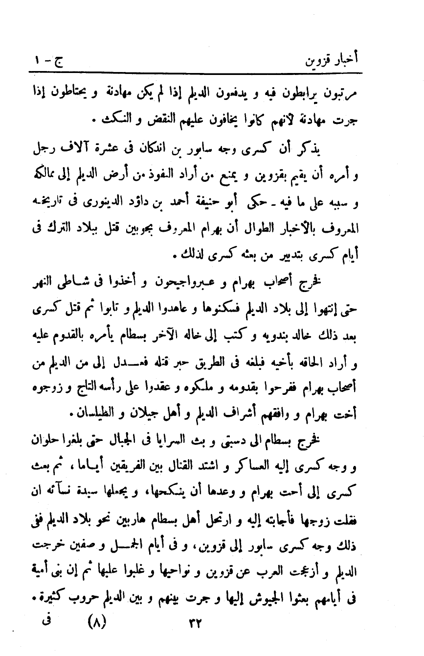 فخرج بسطام إلى دسبتى وبث السرايا في الجبال حتى بلغوا حلوان ووجه كسرى إليه العساكر واشتد القتال بين الفريقين أياما ثم بعث كسرى إلى أخت بهرام ووعدها أن ينكحها ويجعلها سيدة نسائه إن فقلت زوجها فأجابته إليه وارتحل أهل بسطام هاربين نحو بلاد الديلم ففي ذلك وجه كسرى سابور إلى قزوين وفي أيام الجمل وصفين خرجت الديلم وأزعجت العرب عن قزوين ونواحيها وغلبوا عليها ثم إن بني أمية في أيامهم بعثوا الجيوش إليها وجرت بينهم وبين الديلم حروب كثيرة.