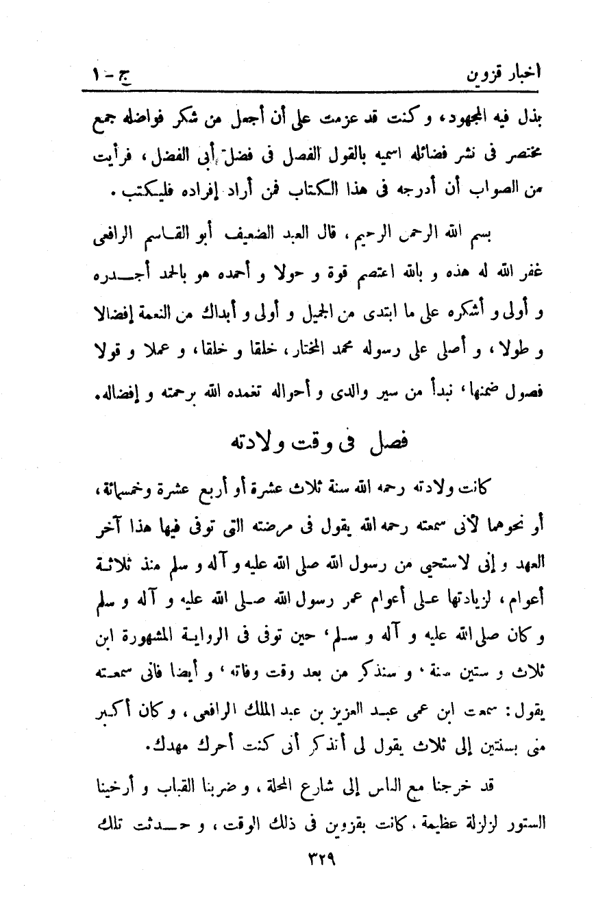 بسم اللَّه الرحمن الرحيم قَالَ العَبْد الضعيف أبو القاسم الرافعي: غفر اللَّه له هذه وبالله اعتصم قوة وحولا وأحمده هو بالحمد أجدره وأولى وأشكره على ما ابتدى من الجميل وأولى وأبداك من النعمة إفضالا وطولا وأصلي على رسوله مُحَمَّد المختار خلقا وخلقا وعملا وقولا فصول ضمنها نبدأ من سير والدي وأحواله تغمده اللَّه برحمته وإفضاله.