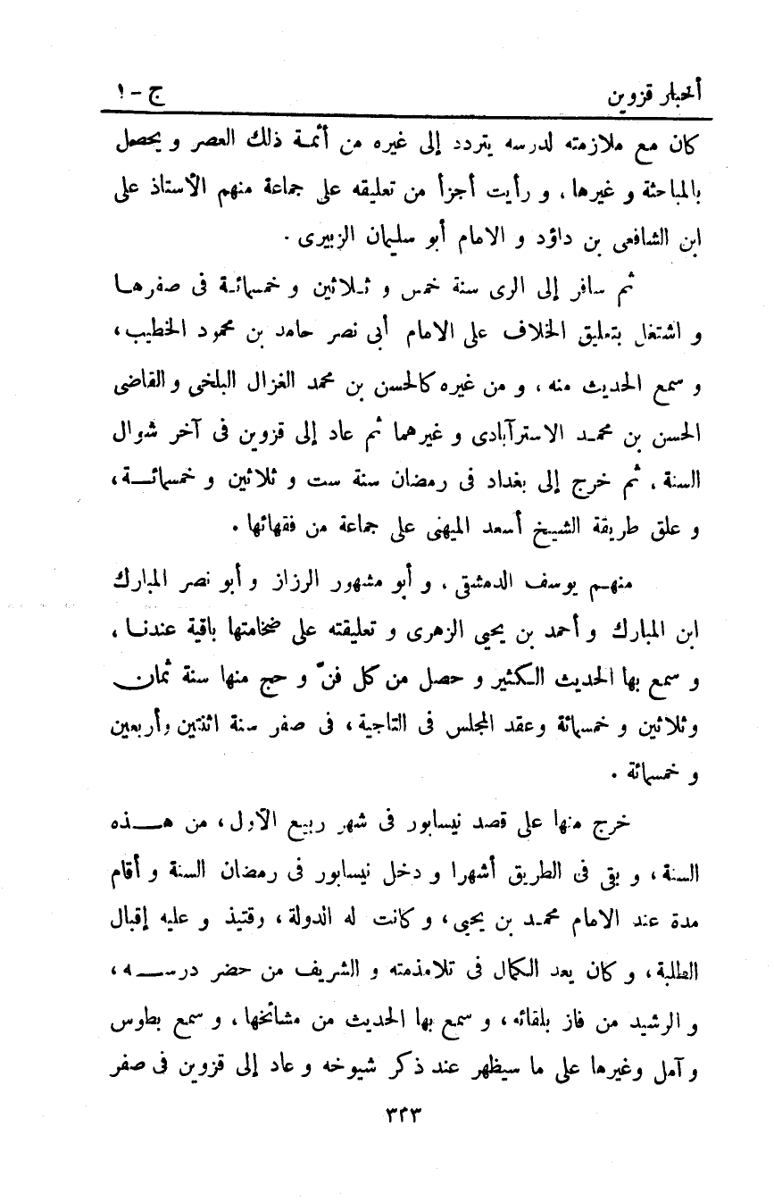 خرج منها على قصد نيسابور في شهر ربيع الأول من هذه السنة وبقي في الطريق أشهرا ودخل نيسابور في رمضان السنة وأقام مدة عند الإمام مُحَمَّد بْن يحيى وكانت له الدولة وقتيذ وعليه إقبال الطلبة وكان يعد الكمال في تلامذمته والشريف من حضر درسه والرشيد من فاز بلقائه وسمع بها الحديث من مشائخها وسمع بطوس وآمل وغيرها على ما سيظهر عند ذكر شيوخه وعاد إلى قزوين في صفر