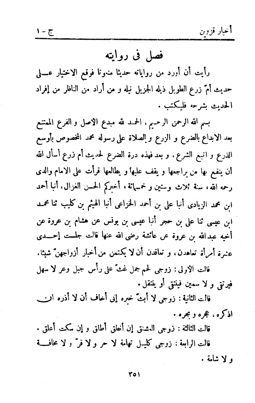 بسم اللَّه الرحمن الرحيم الحمد لله مبدع الأصل والفرع الممتنع بعد الإبداع بالضرع والزرع والصلاة على رسوله مُحَمَّد المخصوص بأوسع الذرع واتبع الشرع وبعد فهذه درة الضرع لحديث أم زرع أسأل اللَّه أن ينفع بها من يراجعها ويقف عليها ويطالعها قَرَأْتُ عَلَى الإِمَامِ وَالِدِي رَحِمَهُ اللَّهُ سنة ثلاث وستين وخمسمائة أَخْبَرَكُمُ الْحَسَنُ الْغَزَّالُ أَنْبأَ أَحْمَدُ ابن مُحَمَّدٍ الزِّيَادِيُّ أَنْبَأَ عَلِيُّ بْنُ أَحْمَدَ الْخُزَاعِيُّ أَنْبَأَ الْهَيْثَمُ بْنُ كليب ثنا محمد ابن عِيسَى ثَنَا عَلِيُّ بْنُ حُجْرٍ أَنْبَأَ عِيسَى بْنُ يُونُسَ عَنْ هِشَامِ بْنِ عُرْوَةَ عَنْ أَخِيهِ عَبْدِ اللَّهِ بْنِ عُرْوَةَ عَنْ عَائِشَةَ رَضِيَ اللَّهُ عَنْهَا قَالَتْ جَلَسَتْ إِحْدَى عَشْرَةَ امْرَأَةٍ تَعَاهَدْنَ وَتَعَاقَدْنَ أَنْ لا يَكْتُمْنَ مِنْ أَخْبَارِ أَزْوَاجِهِنَّ شَيْئًا.
